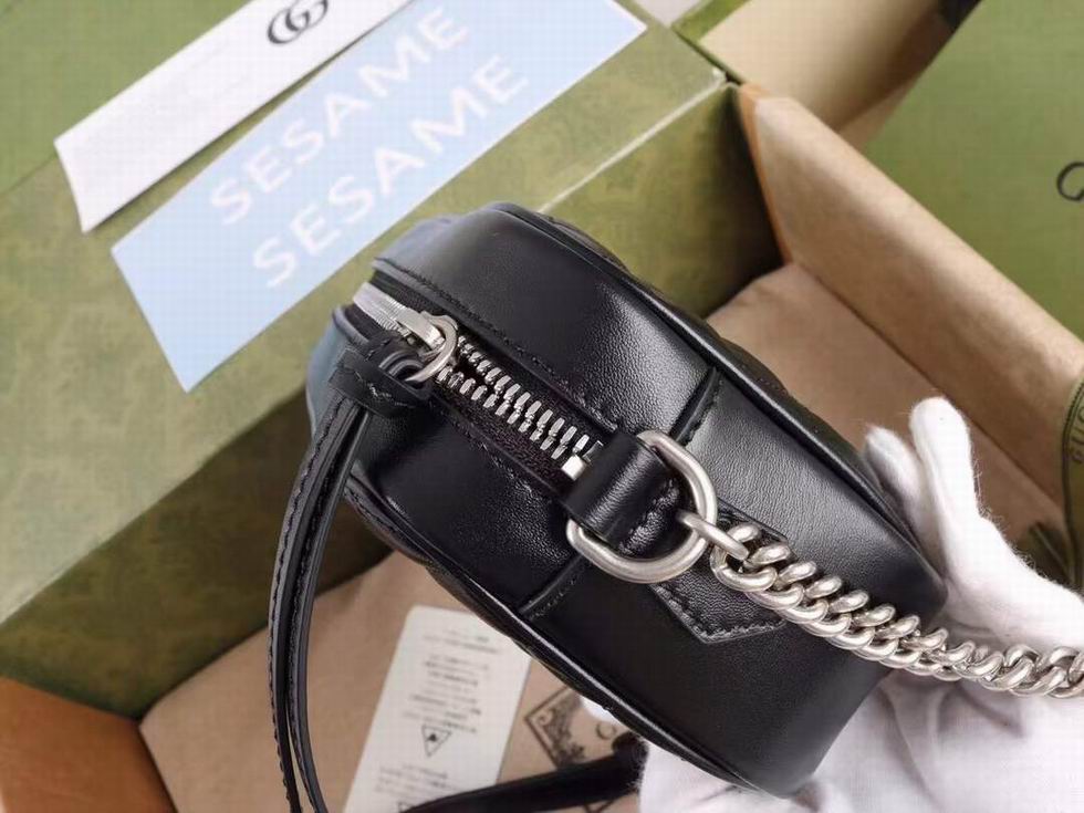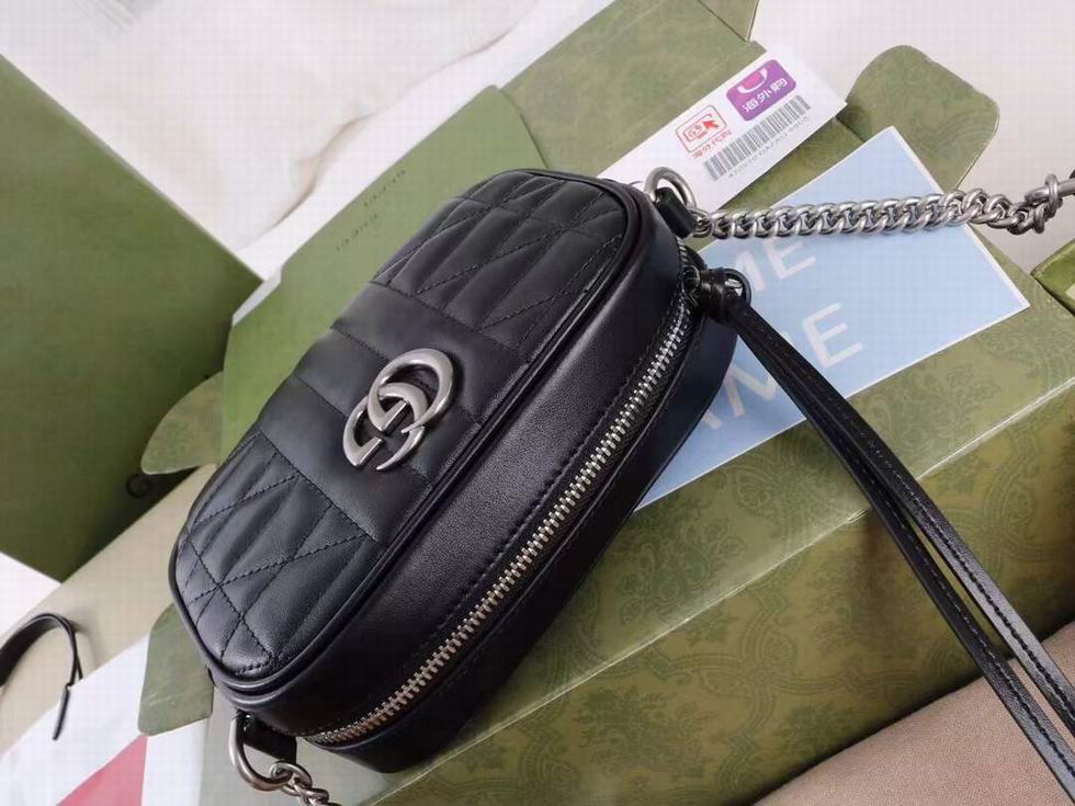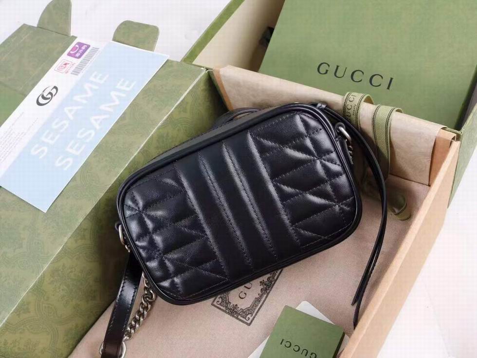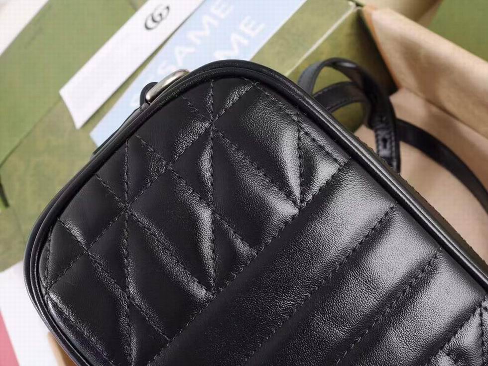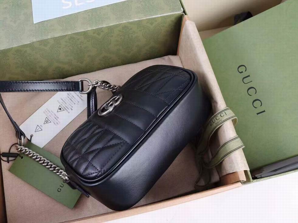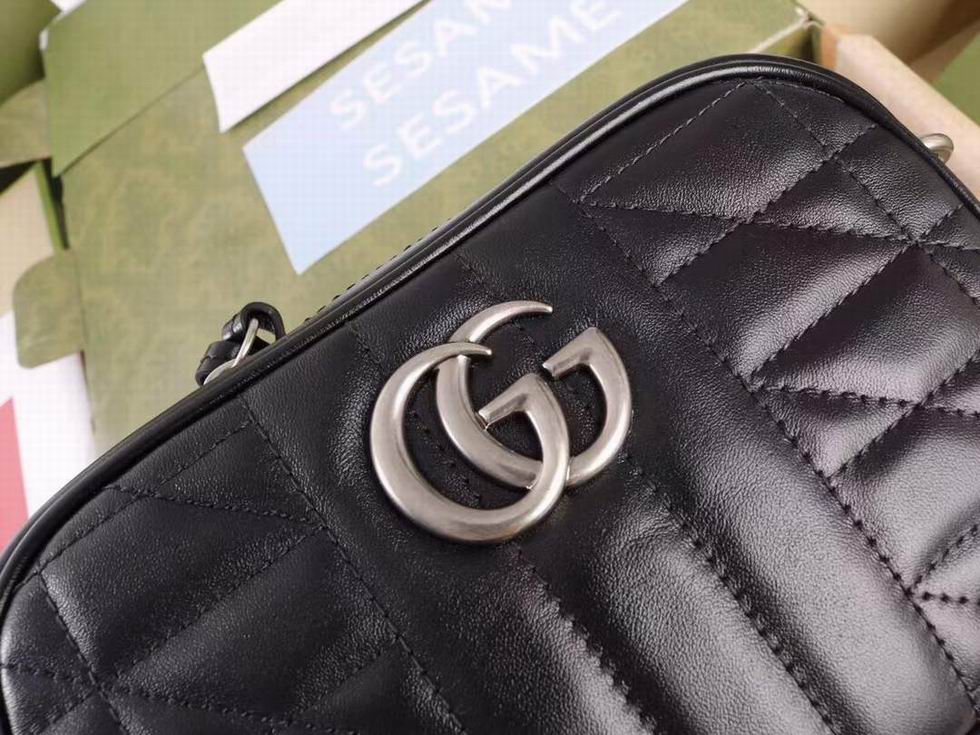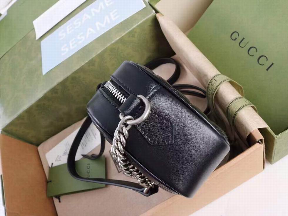 The GG Marmont is characterized by the brand's emblematic monogram hardware and matelass?� leather. For The Gucci Aria collection, the style is reimagined with a new geometric approach to the signature material while its Double G hardware is presented with an antique silver-toned finish. The design appears here in the shape of a small shoulder bag in black.