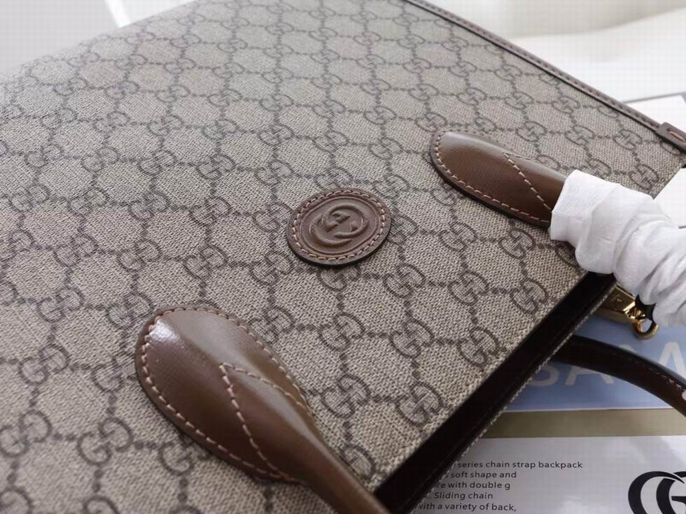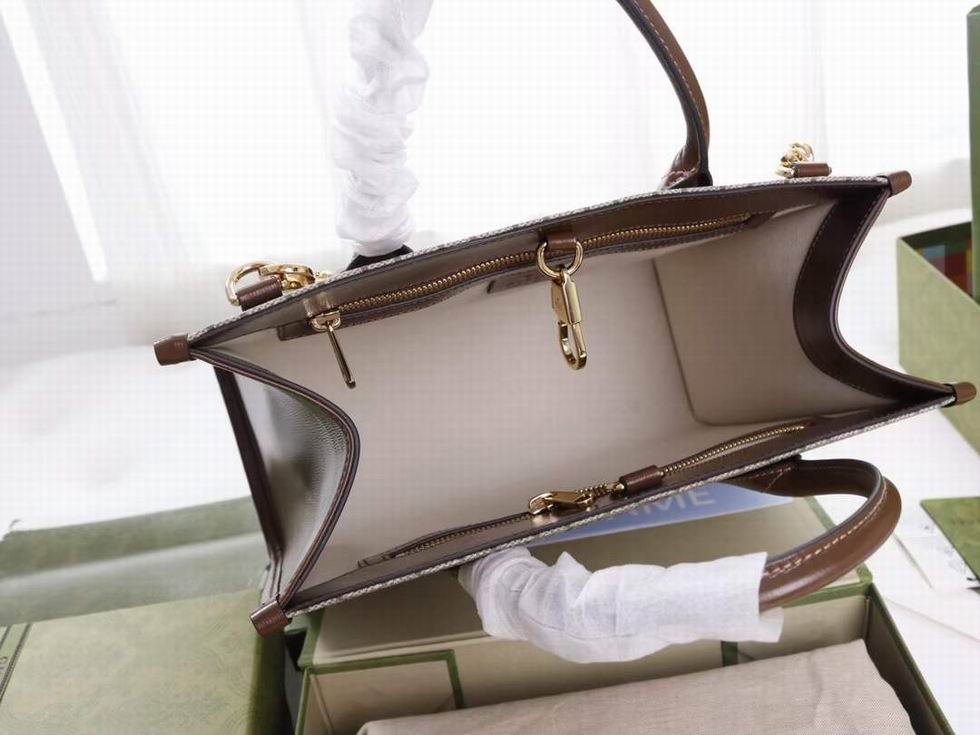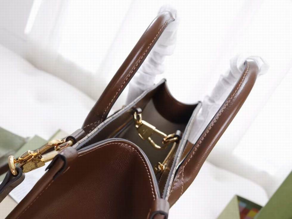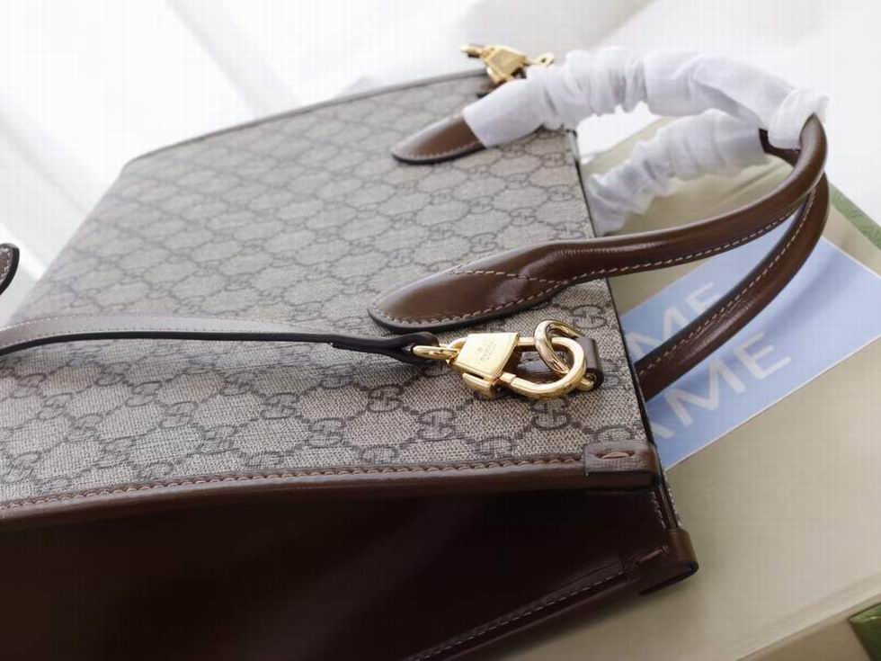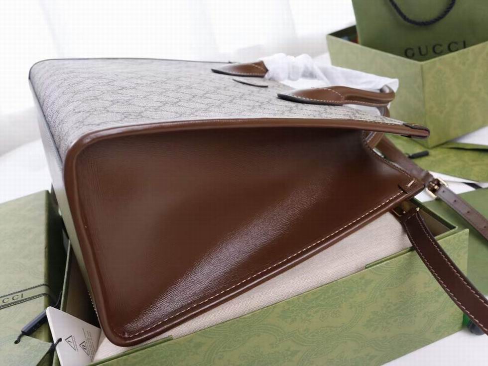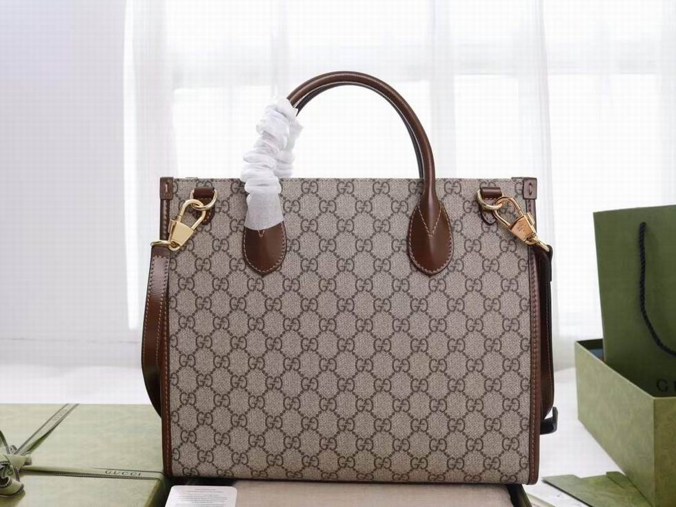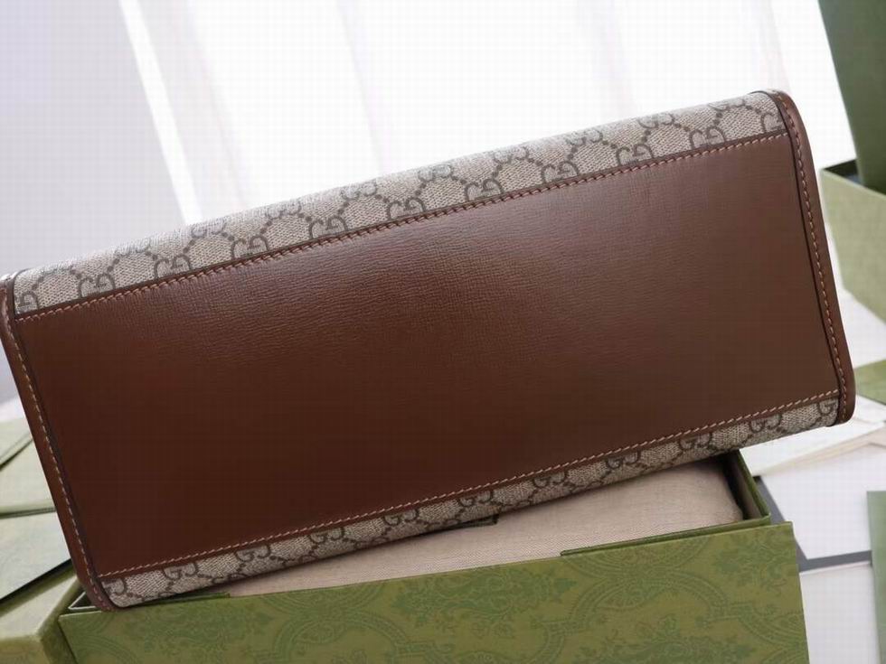 Designed in a structured shape, this small tote bag is crafted from GG Supreme canvas with brown leather trim, the small size double-handled silhouette has a top handle and shoulder strap.