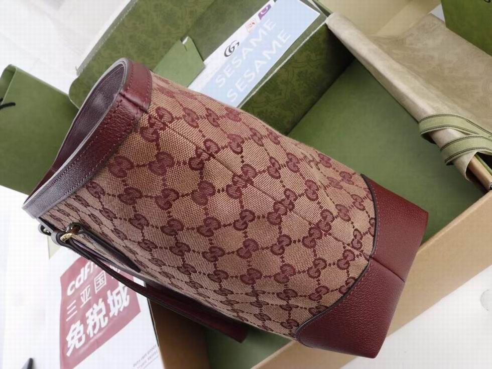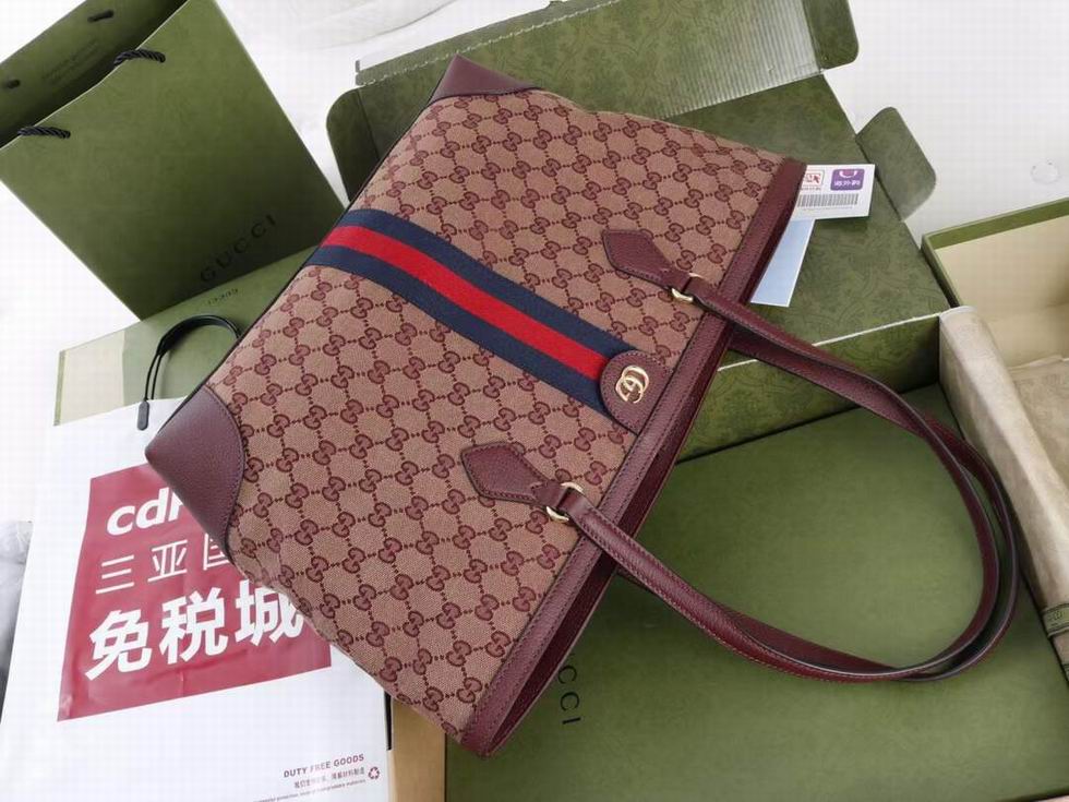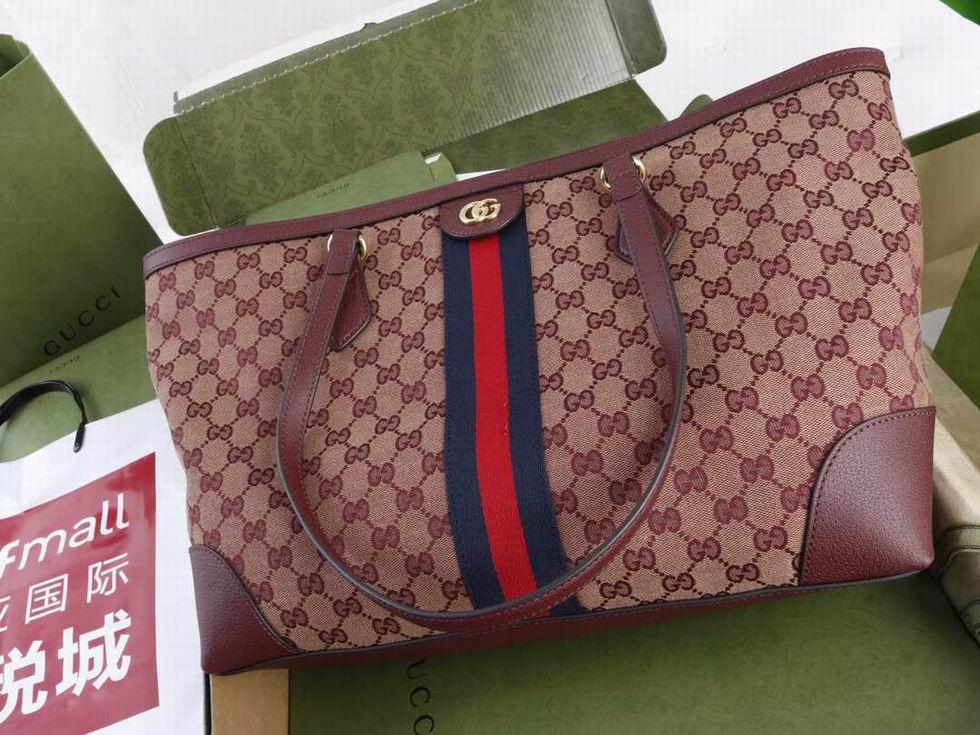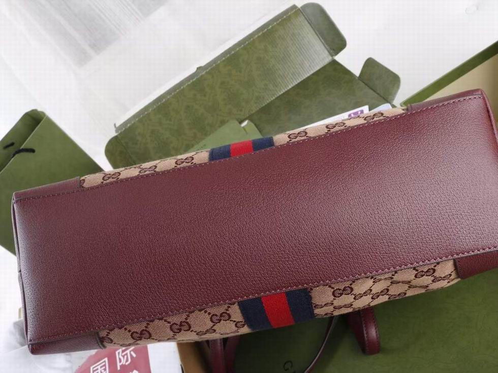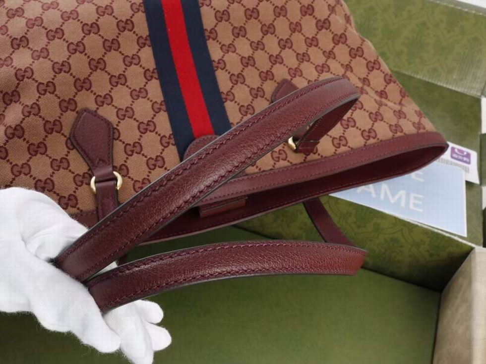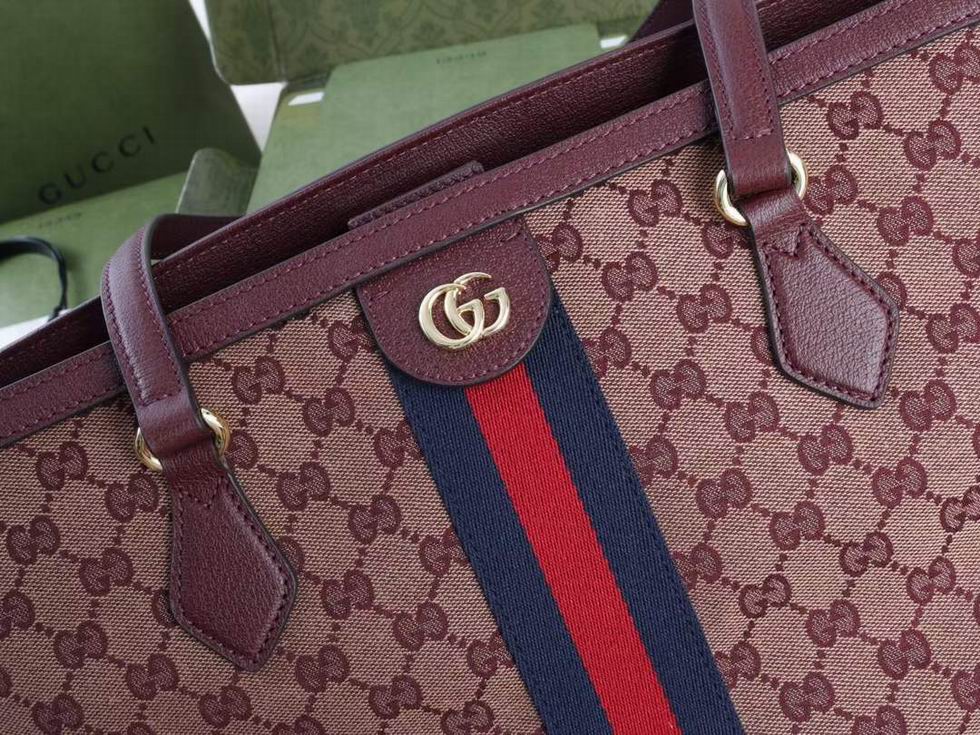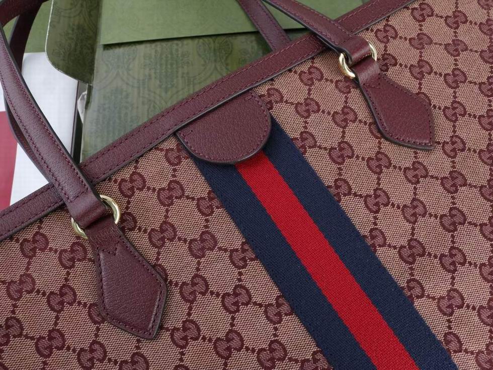 A classic combination of the House's most defining codes??the GG motif and Web stripe??the world of Ophidia continues to evolve, incorporating new shapes and silhouettes each season. With recognizable design elements in a practical new shape, this new medium sized tote is trimmed with textured leather and topped with Double G hardware. Thanks to its long leather handles, the style can also be carried as a shoulder bag.