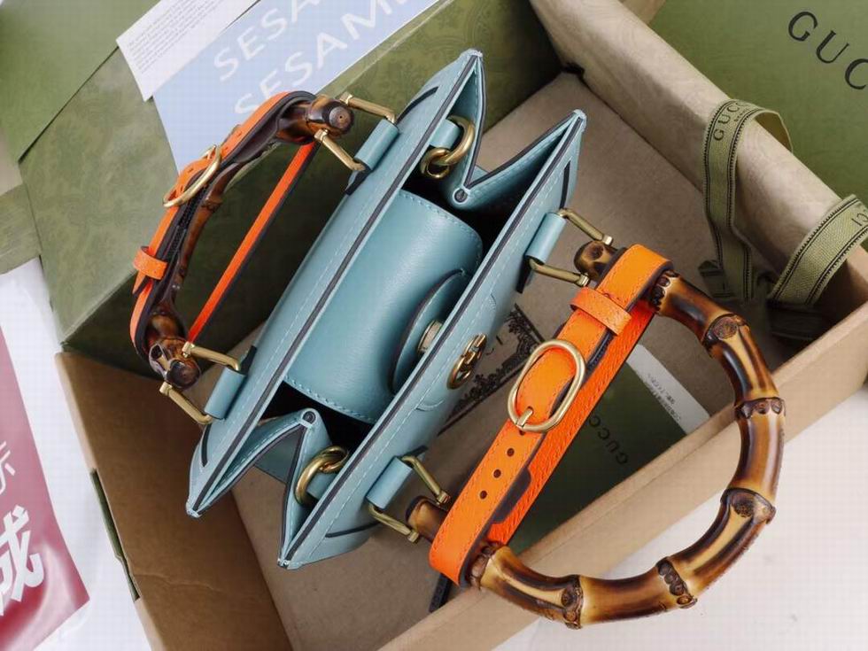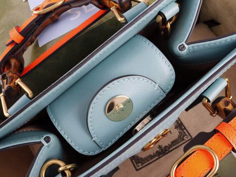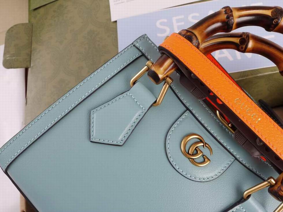 Instantly recognizable emblems of the brand, logos enrich designs in new and unexpected ways. Behind every logo lies the tradition and value of the House, an everlasting medium one can wear again and again. Following the idea of constant change and experimentation, different iterations of the logo have been presented each collection. The jumbo GG, a new, maximalist version of the historic monogram, animates a selection of ready-to-wear and accessories for the Aria collection. This mini Gucci Diana tote is completed by a brown leather trim.