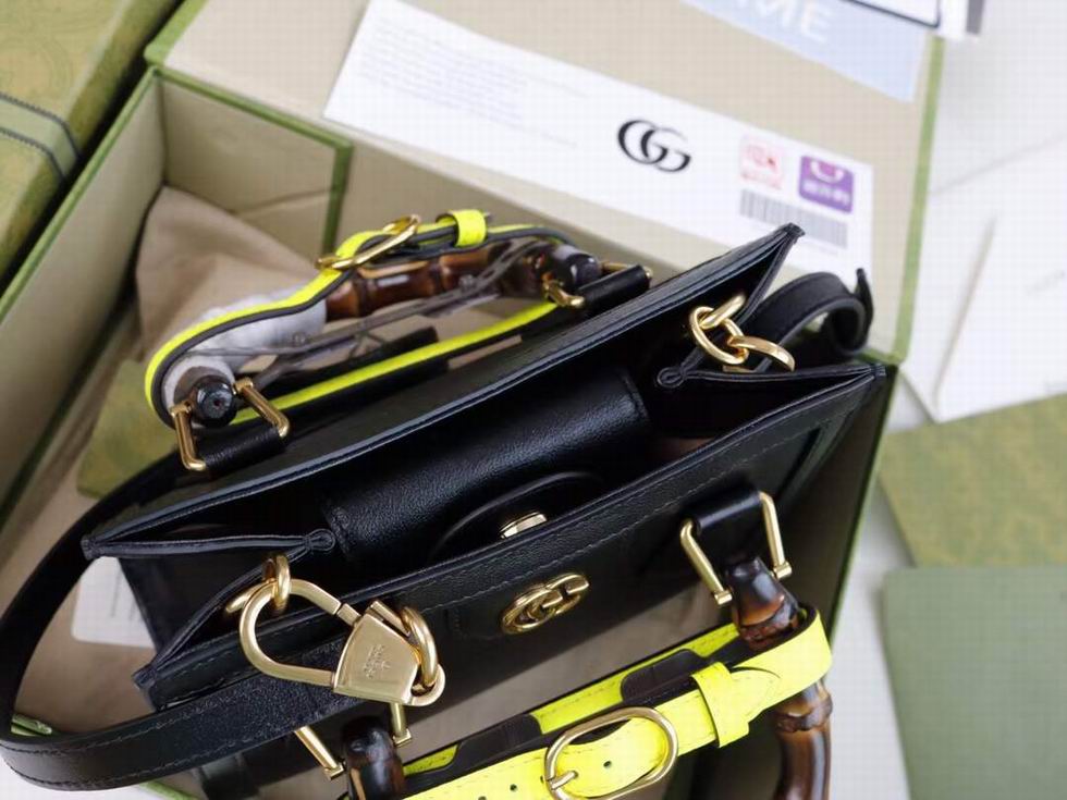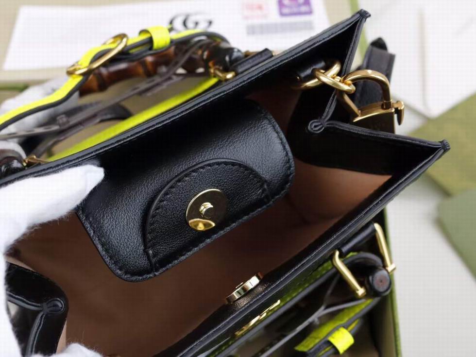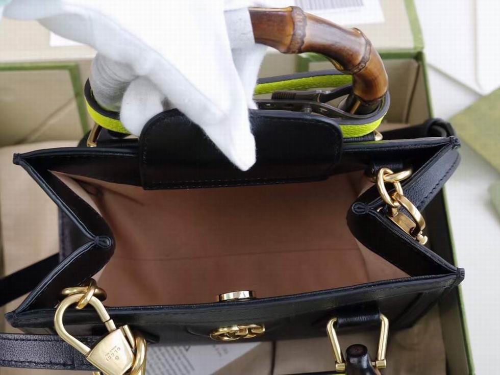 Instantly recognizable emblems of the brand, logos enrich designs in new and unexpected ways. Behind every logo lies the tradition and value of the House, an everlasting medium one can wear again and again. Following the idea of constant change and experimentation, different iterations of the logo have been presented each collection. The jumbo GG, a new, maximalist version of the historic monogram, animates a selection of ready-to-wear and accessories for the Aria collection. This mini Gucci Diana tote is completed by a brown leather trim.