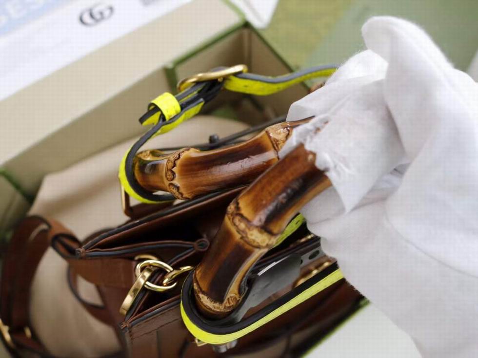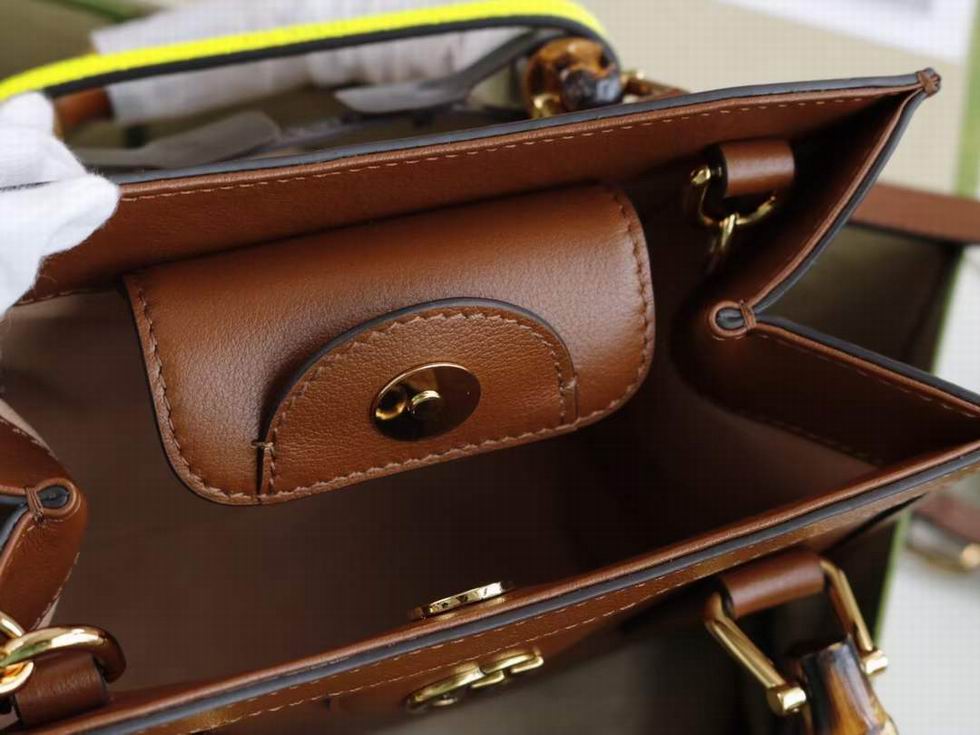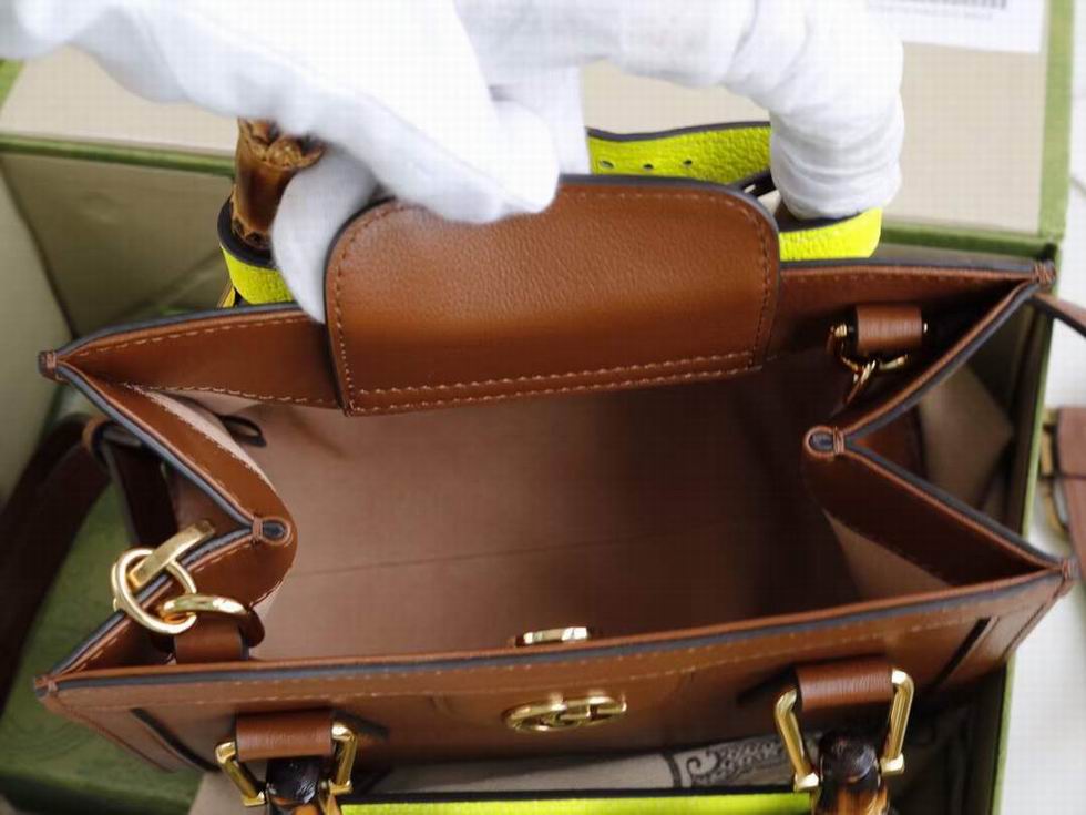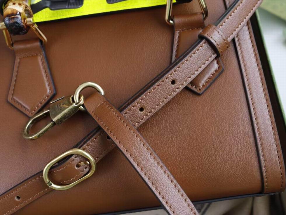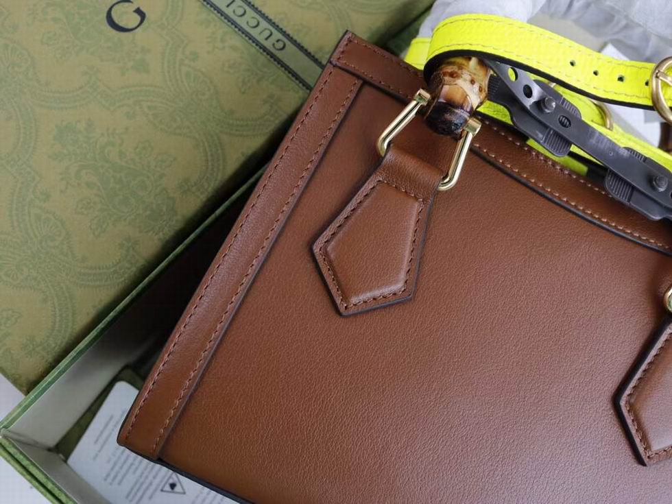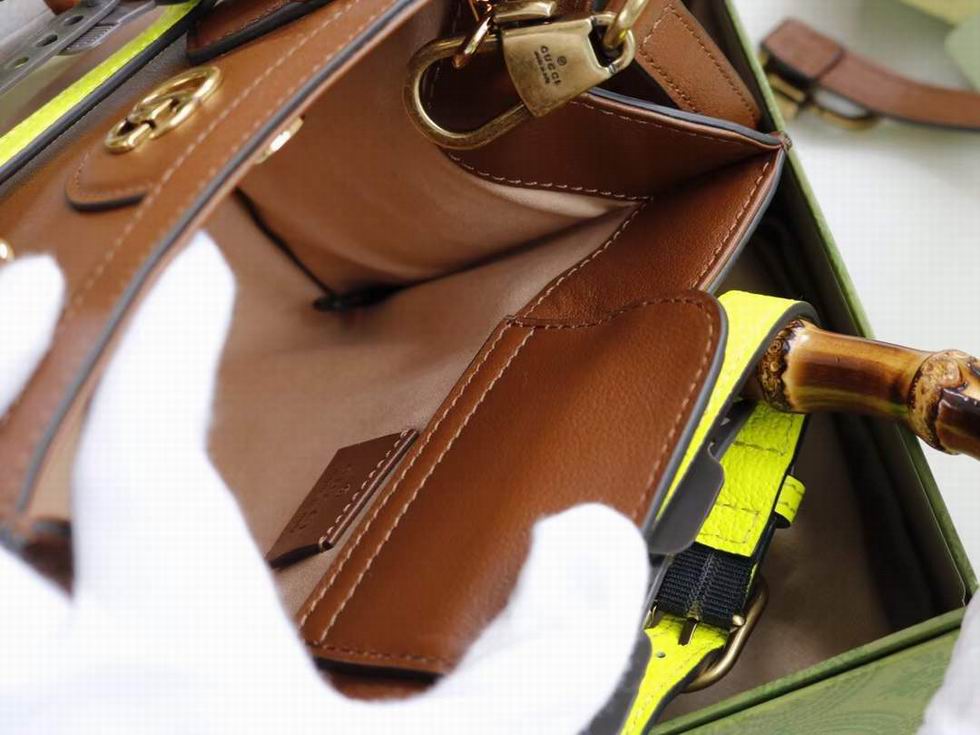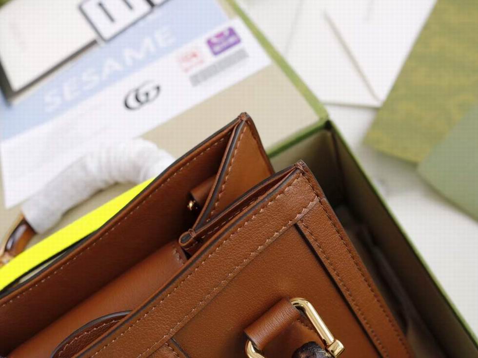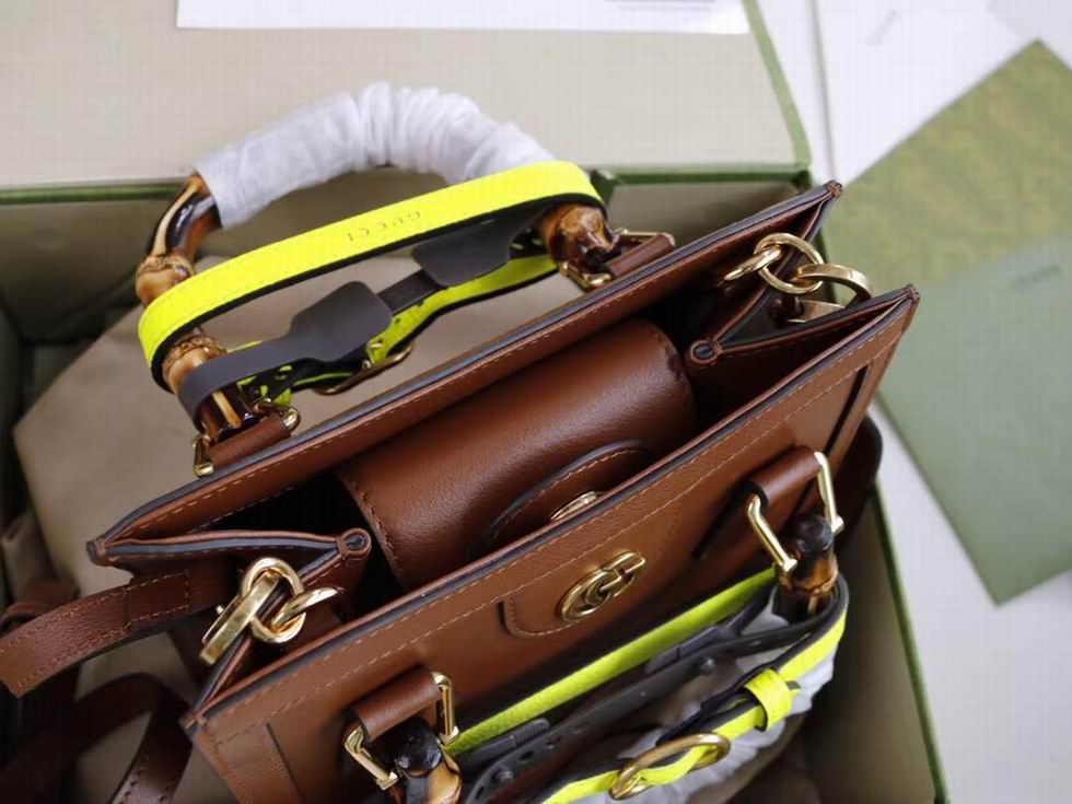 Instantly recognizable emblems of the brand, logos enrich designs in new and unexpected ways. Behind every logo lies the tradition and value of the House, an everlasting medium one can wear again and again. Following the idea of constant change and experimentation, different iterations of the logo have been presented each collection. The jumbo GG, a new, maximalist version of the historic monogram, animates a selection of ready-to-wear and accessories for the Aria collection. This mini Gucci Diana tote is completed by a brown leather trim.