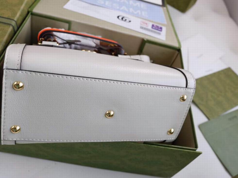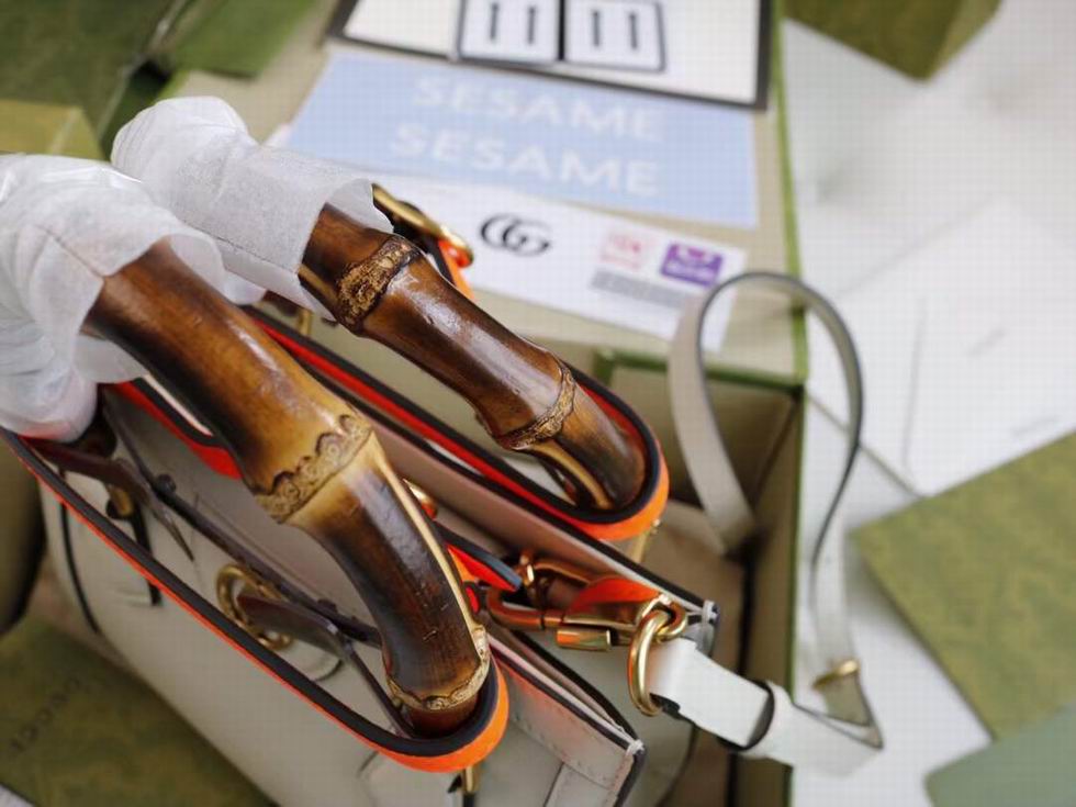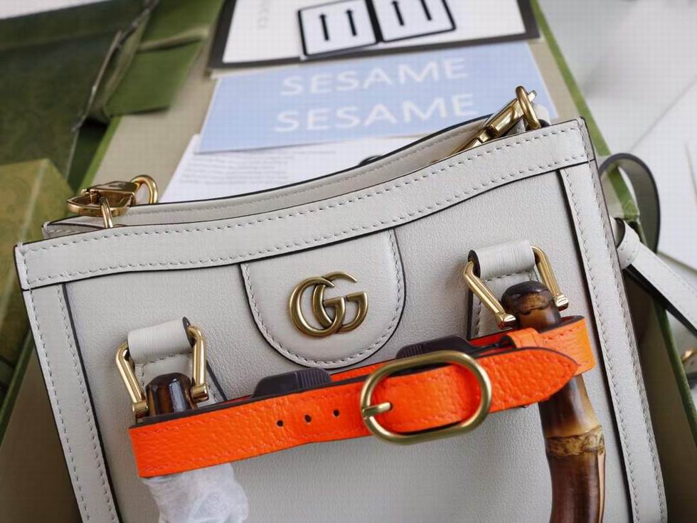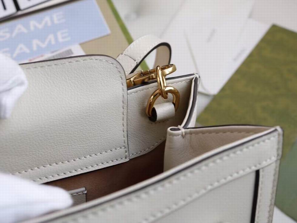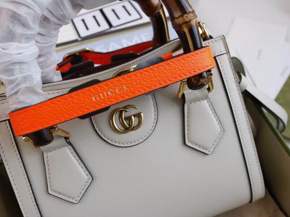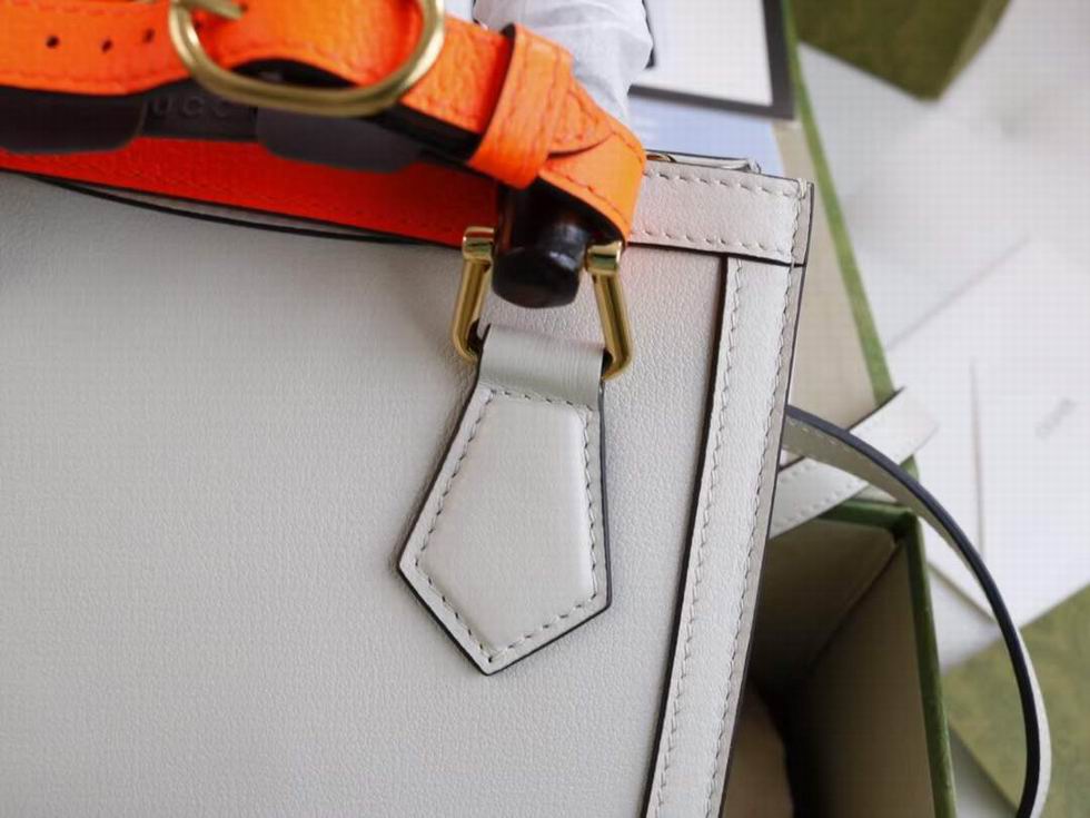 Instantly recognizable emblems of the brand, logos enrich designs in new and unexpected ways. Behind every logo lies the tradition and value of the House, an everlasting medium one can wear again and again. Following the idea of constant change and experimentation, different iterations of the logo have been presented each collection. The jumbo GG, a new, maximalist version of the historic monogram, animates a selection of ready-to-wear and accessories for the Aria collection. This mini Gucci Diana tote is completed by a brown leather trim.