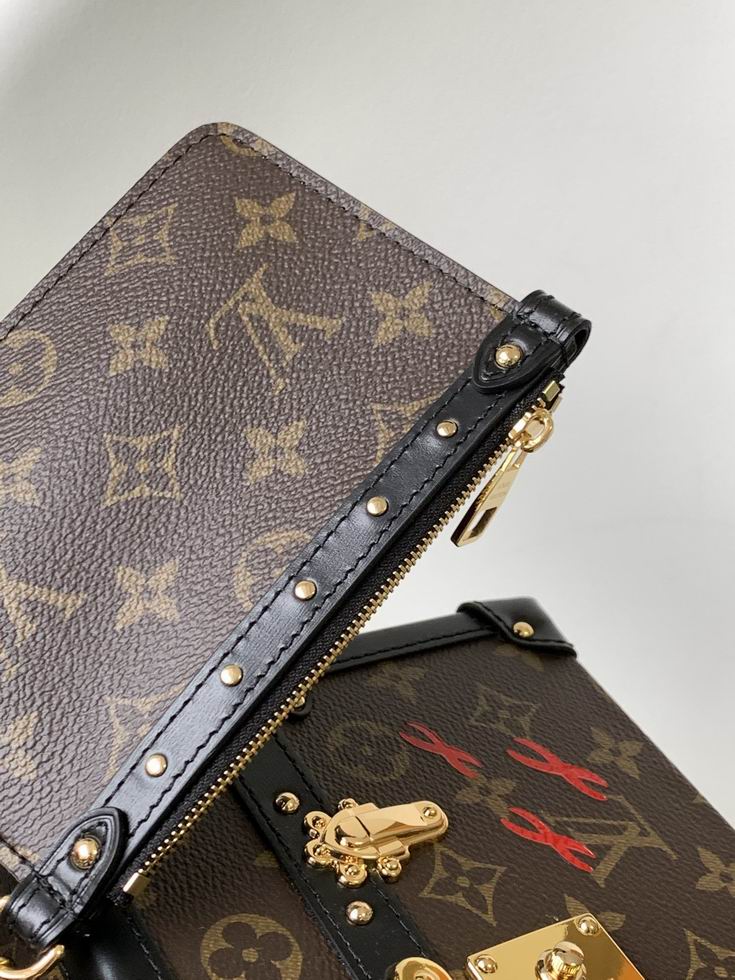 Inside Monogram flat clutch with zip closure attached with a gold-color chain