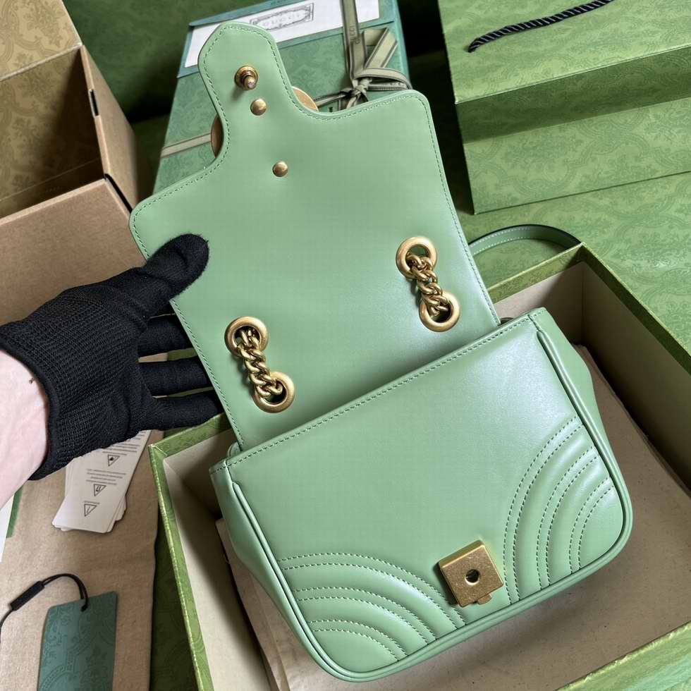 The GG Marmont has become synonymous with the House, thanks to its recognizable matelasse fabric and Double G hardware. Continuously reinvented through the seasons, new shapes are introduced within this signature line, matching Gucci's contemporary vision. Here, it's presented in black leather and further enriched with antique gold-toned details.