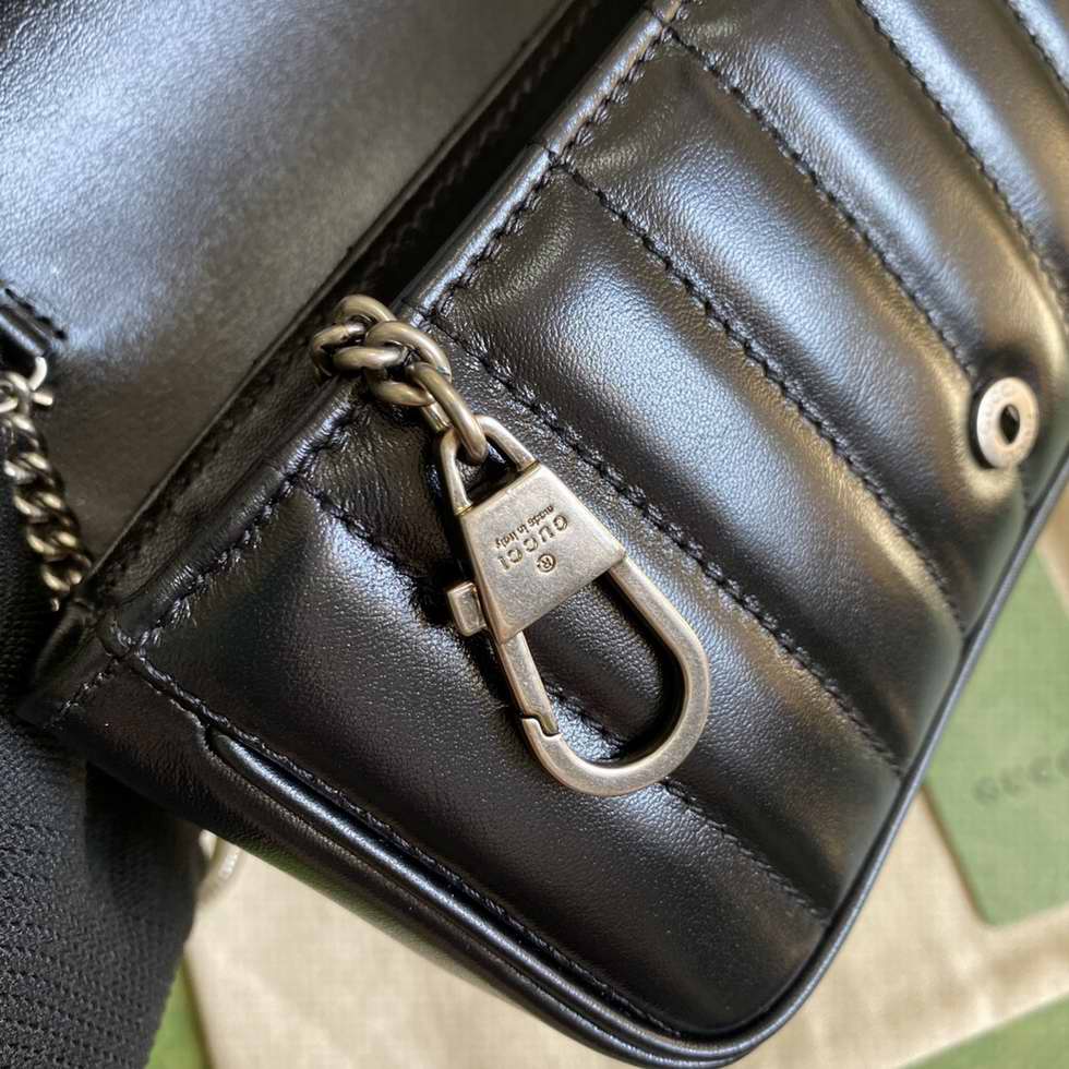 Super mini versions of emblematic accessories channel the House's whimsical narrative. Synonymous with its monogram hardware and matelasse finish, this shoulder bag plays with the GG Marmont's signature elements with a new take on the recognizable quilted design that mixes diagonal and vertical motifs. Appearing since the '70s, the Double G is showcased in an antique silver tone against black leather.