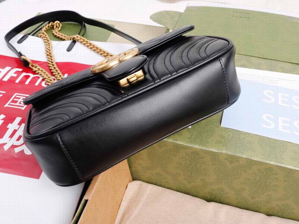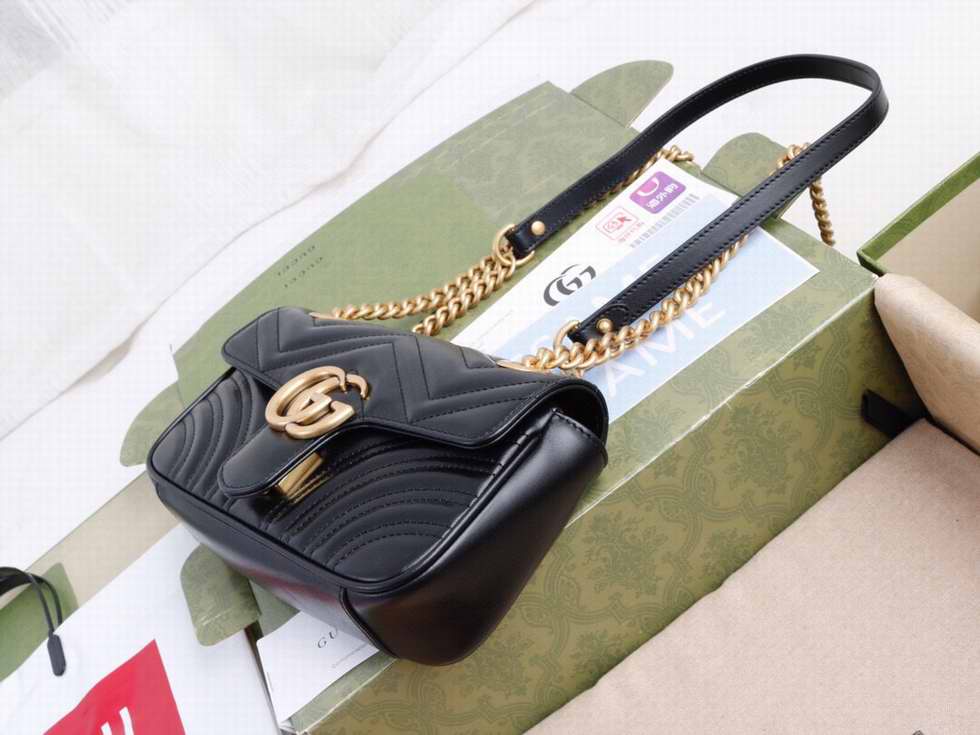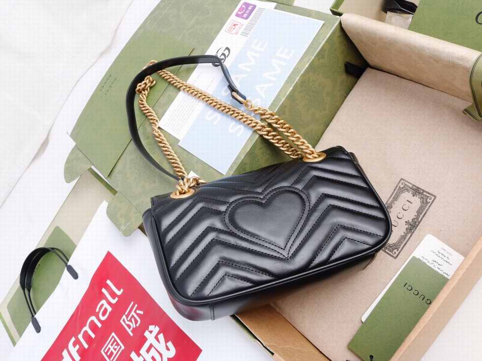 The small GG Marmont flap bag has a softly structured shape and an flap closure with Double G hardware. The sliding chain strap can be worn multiple ways, changing between a shoulder and a top handle bag. Made in matelasse chevron leather with a heart on the back.