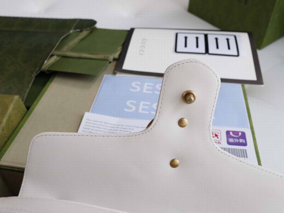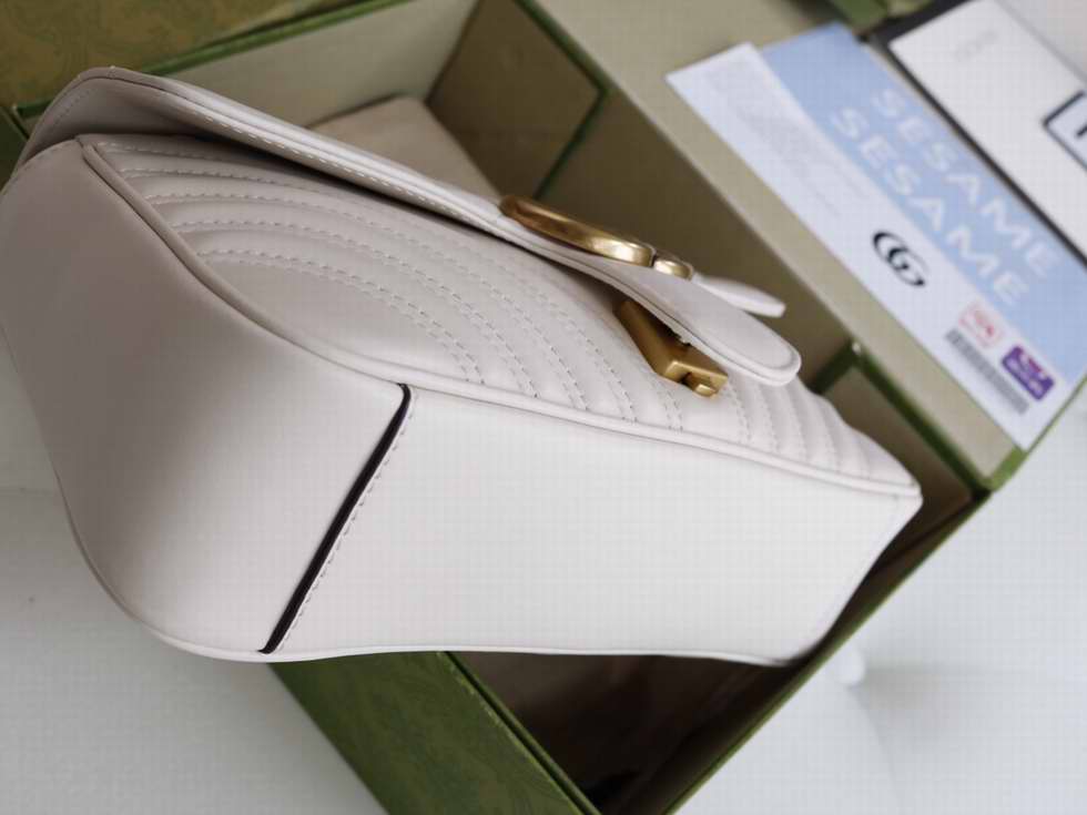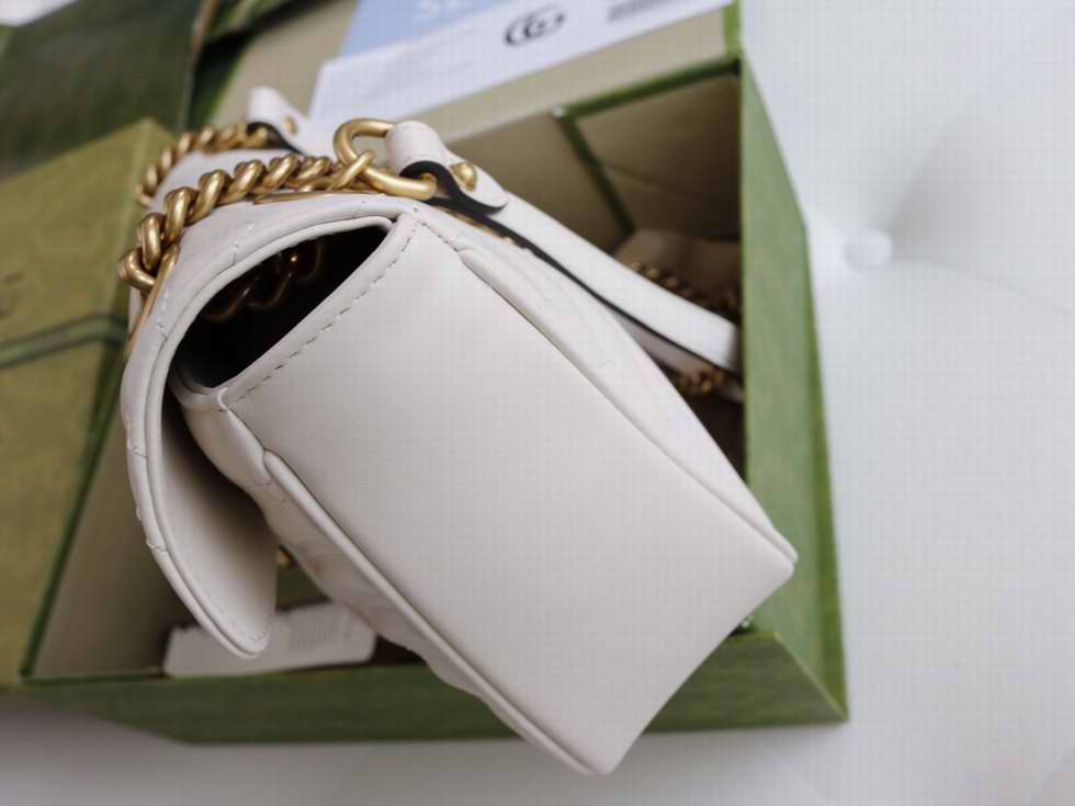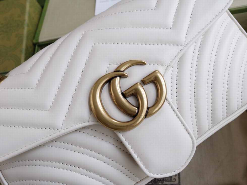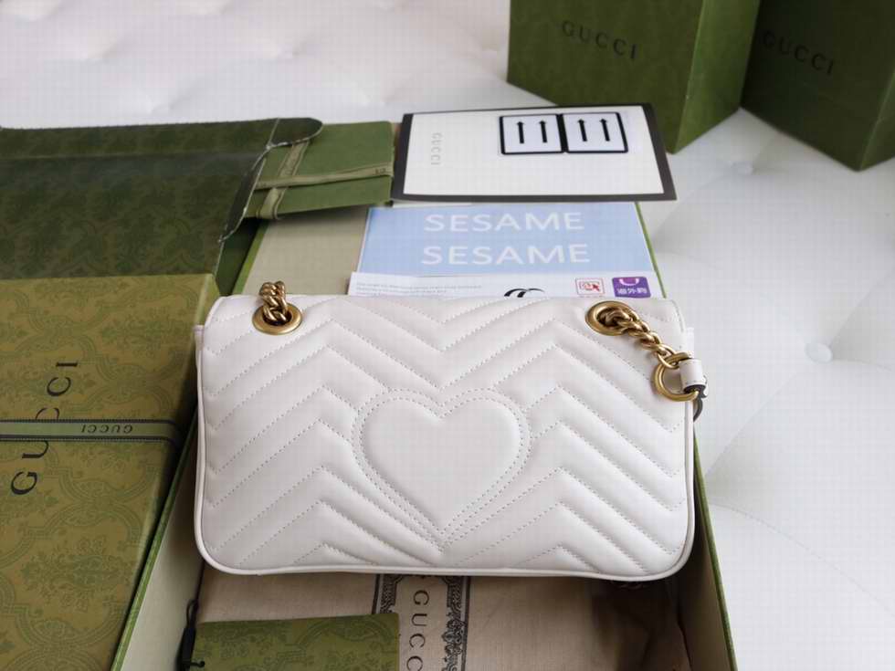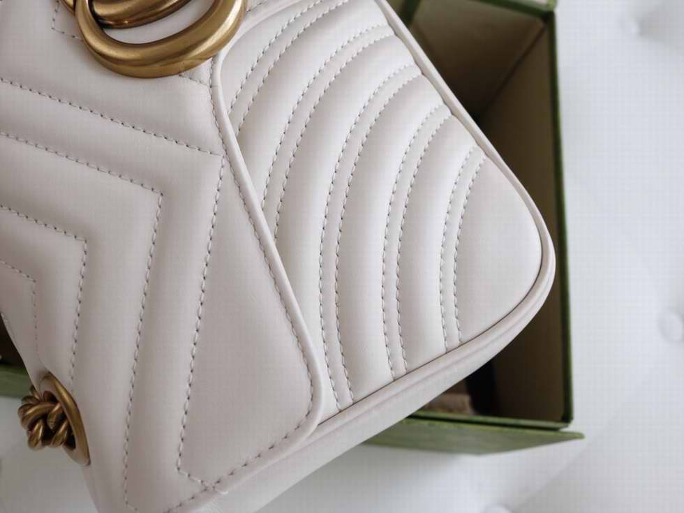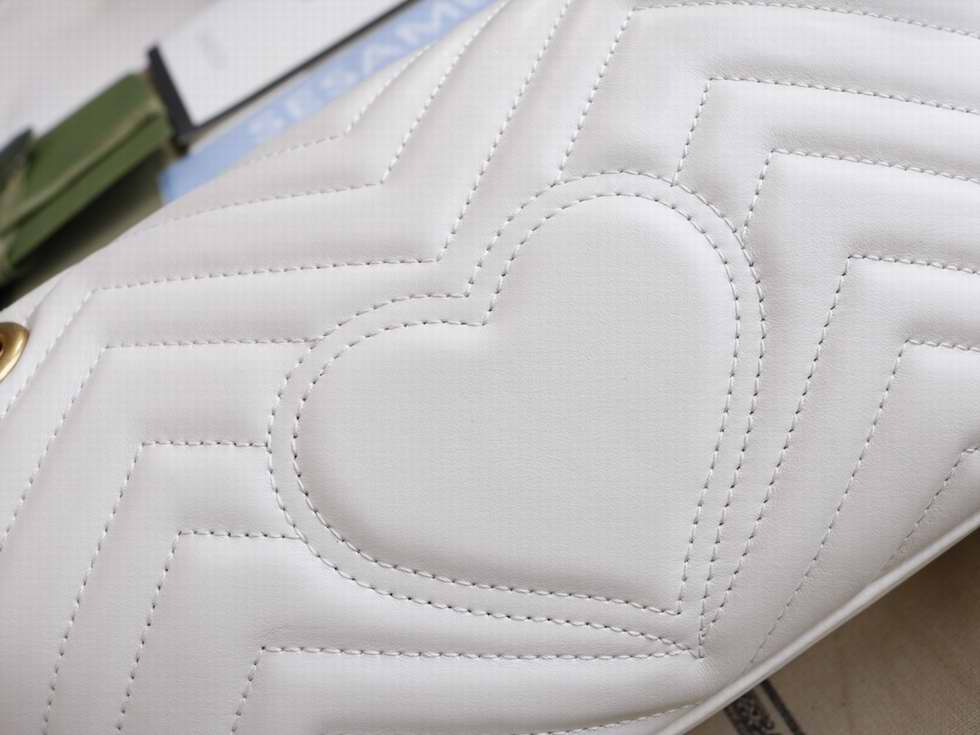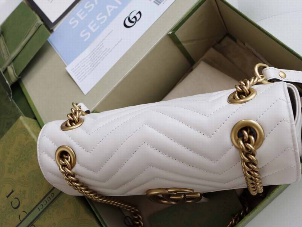 The small GG Marmont chain shoulder bag has a softly structured shape and an oversized flap closure with Double G hardware. The sliding chain strap can be worn multiple ways, changing between a shoulder and a top handle bag. Made in matelasse chevron leather with a heart on the back.