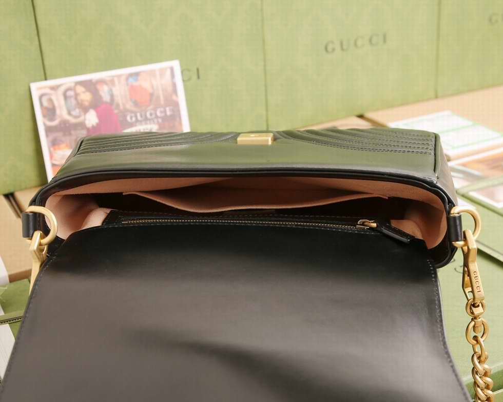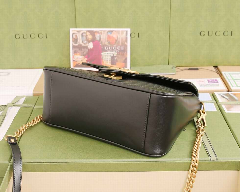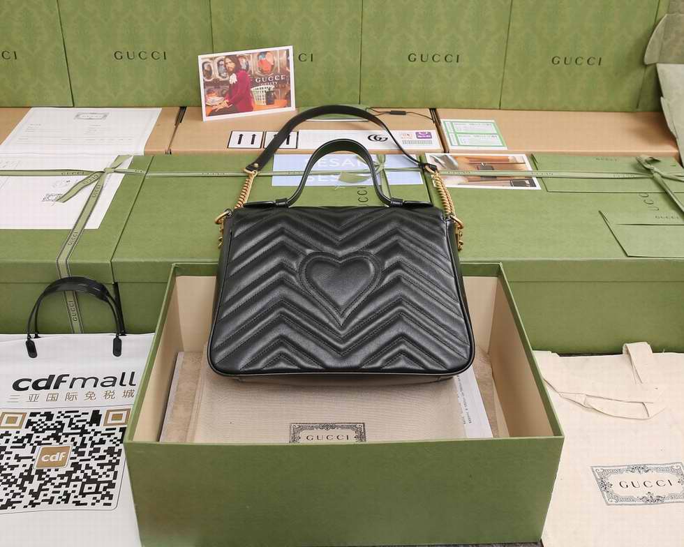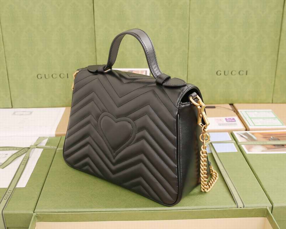 The small GG Marmont top handle bag has a softly structured shape and an oversized flap closure with Double G hardware. Made in matelasse chevron leather with a heart on the back.