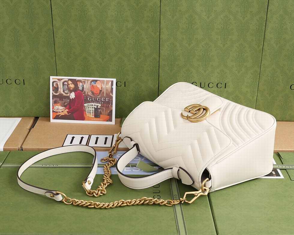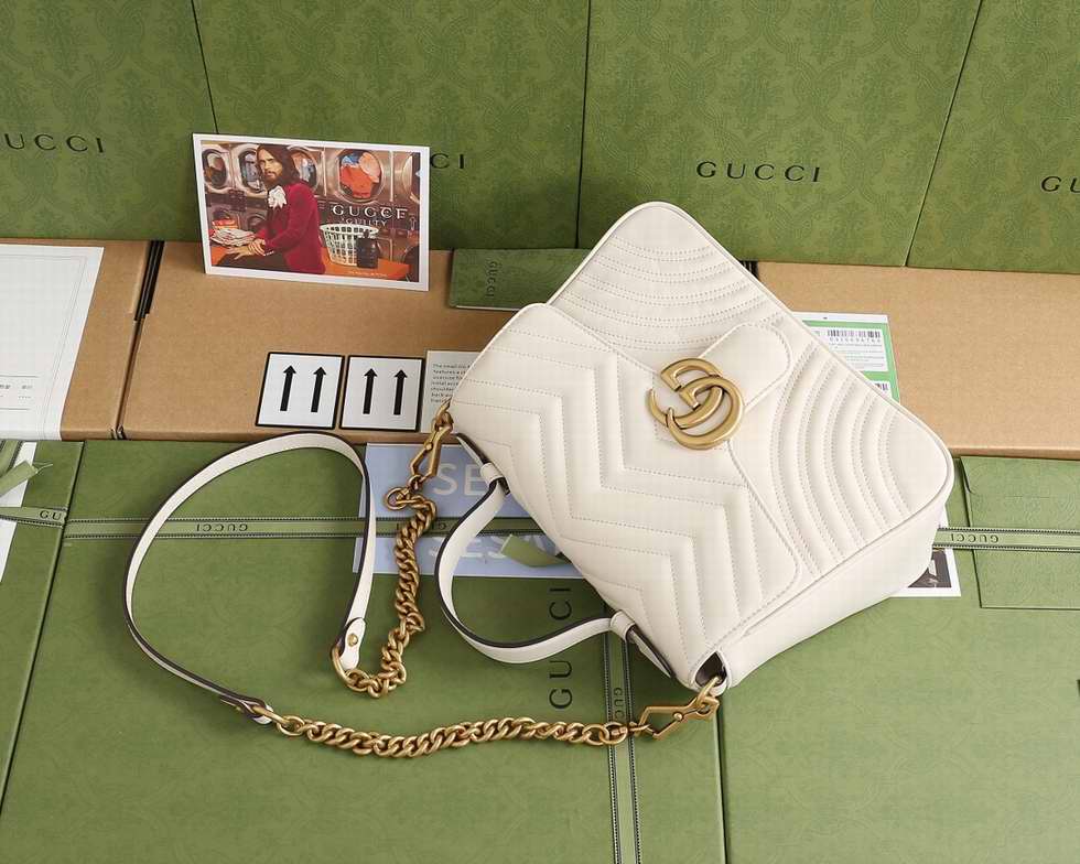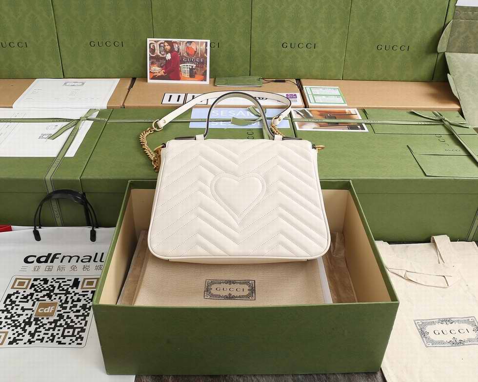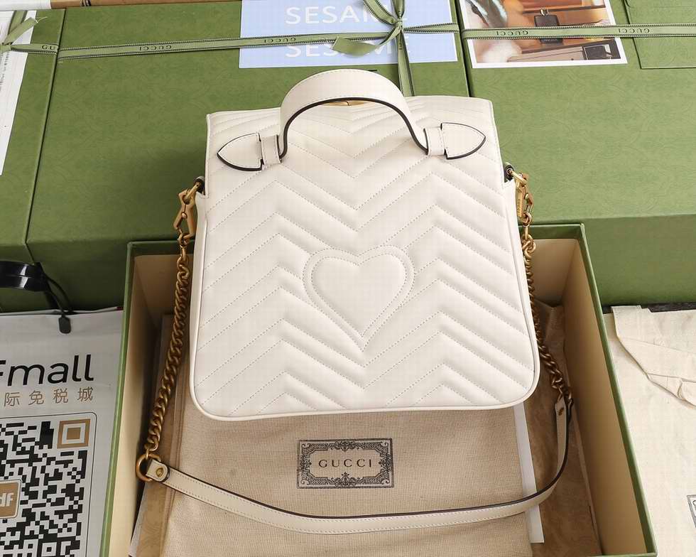 The small GG Marmont top handle bag has a softly structured shape and an oversized flap closure with Double G hardware. Made in matelasse chevron leather with a heart on the back.