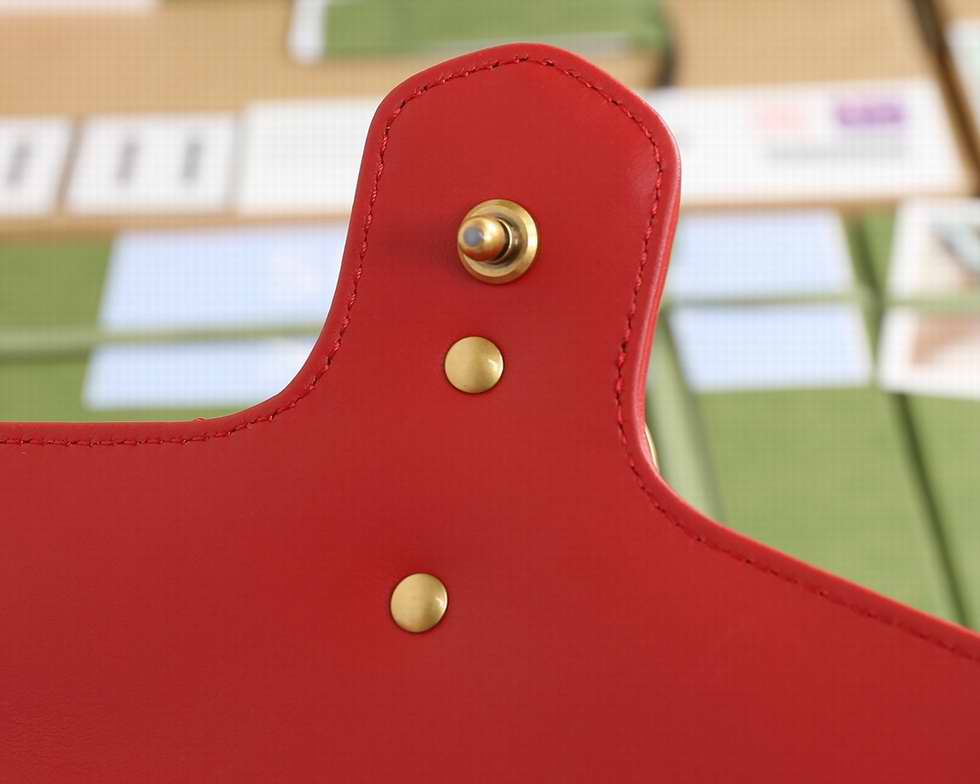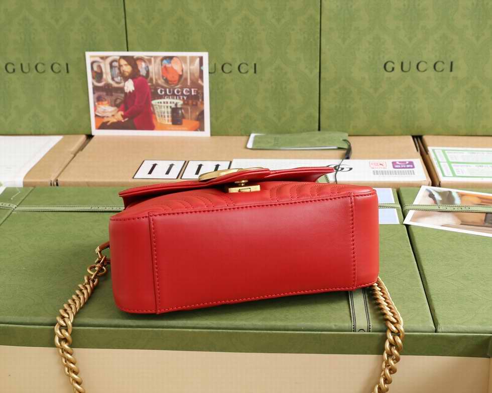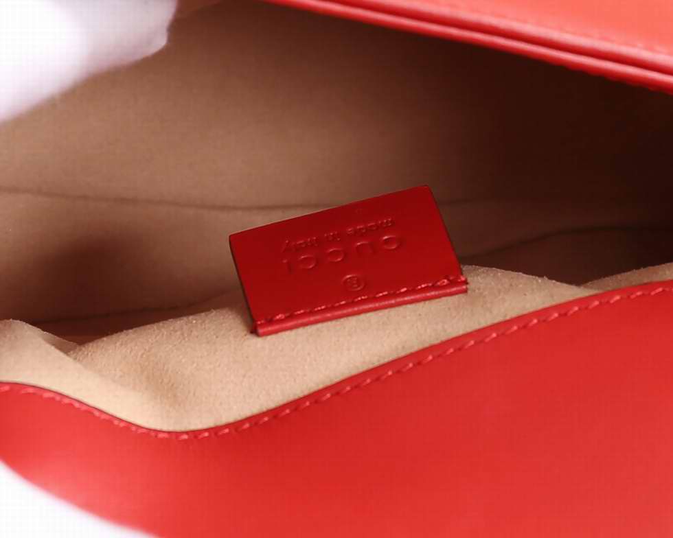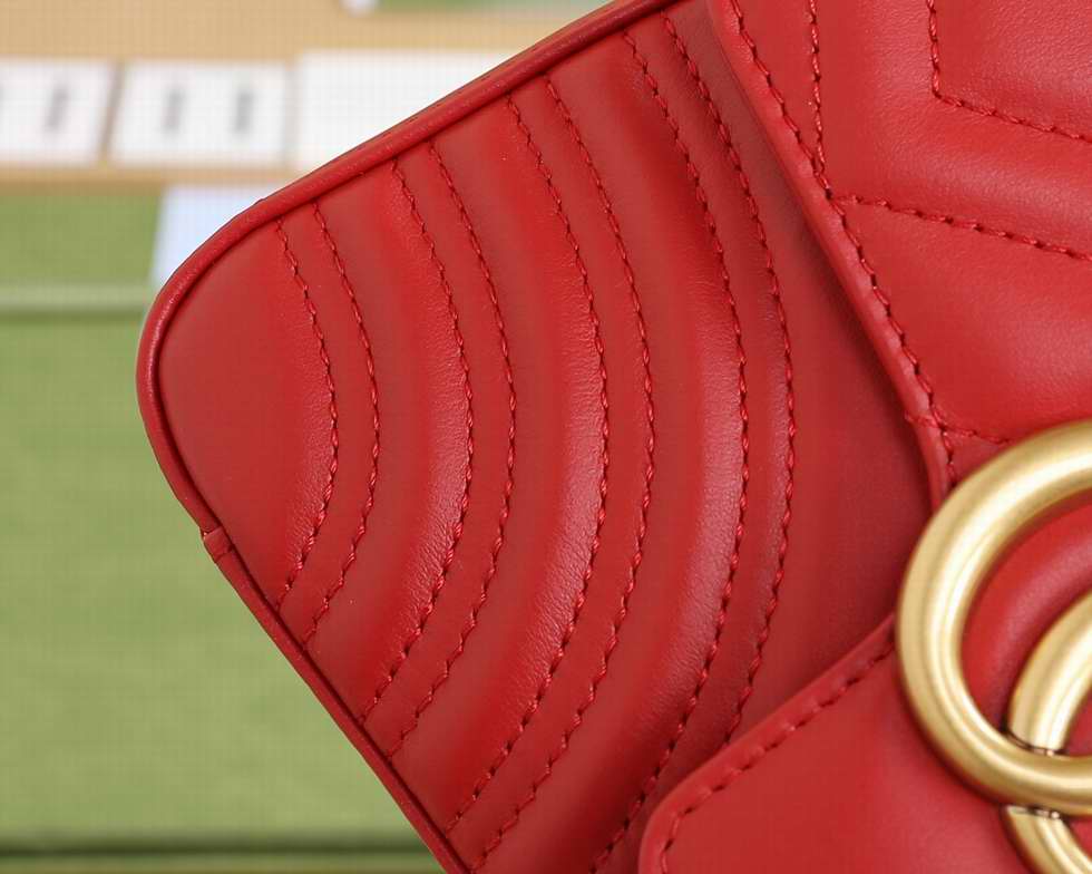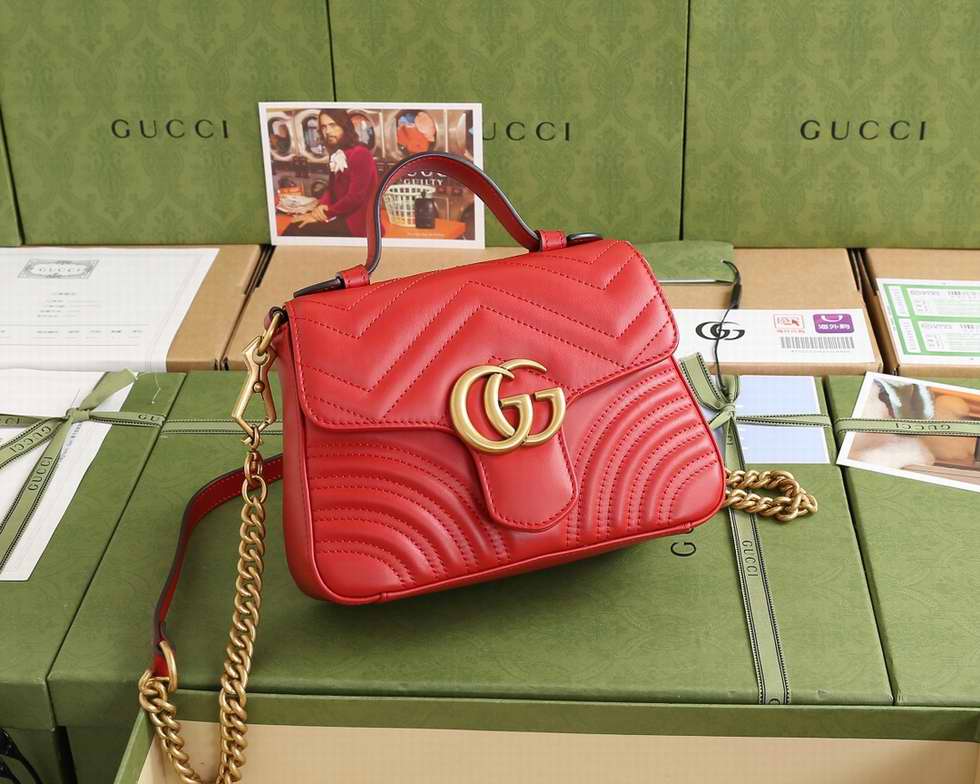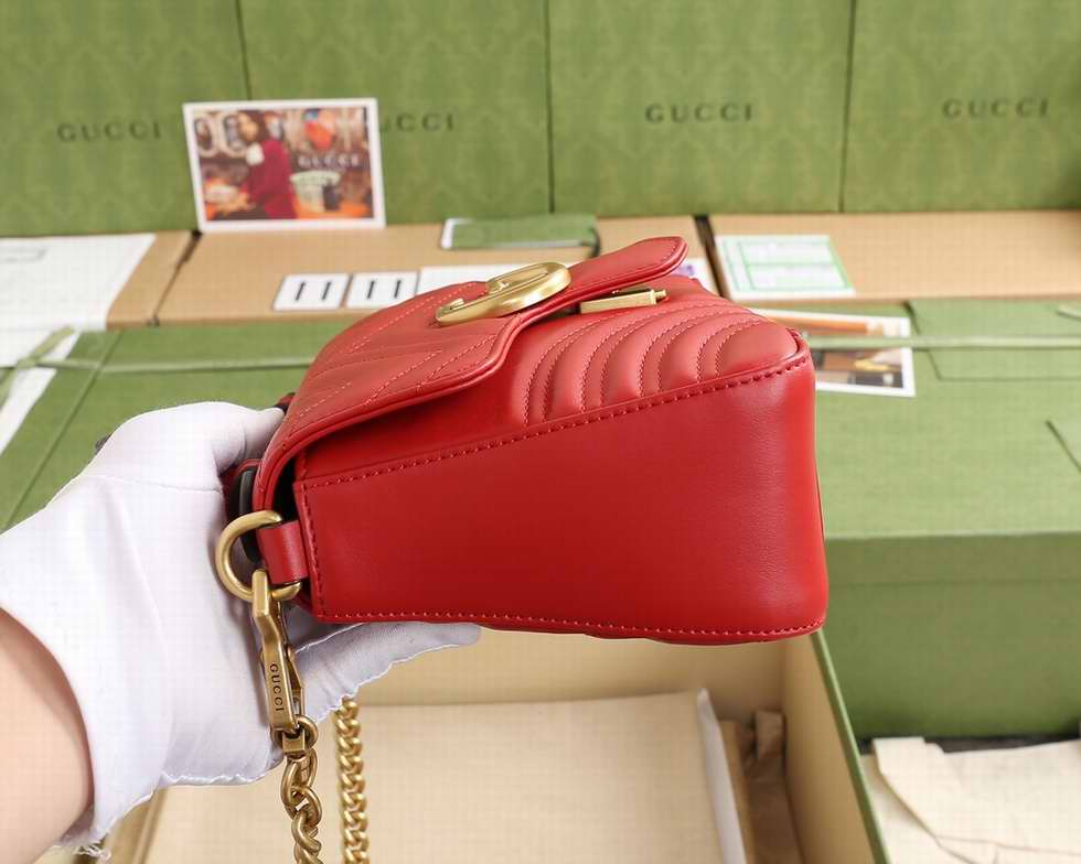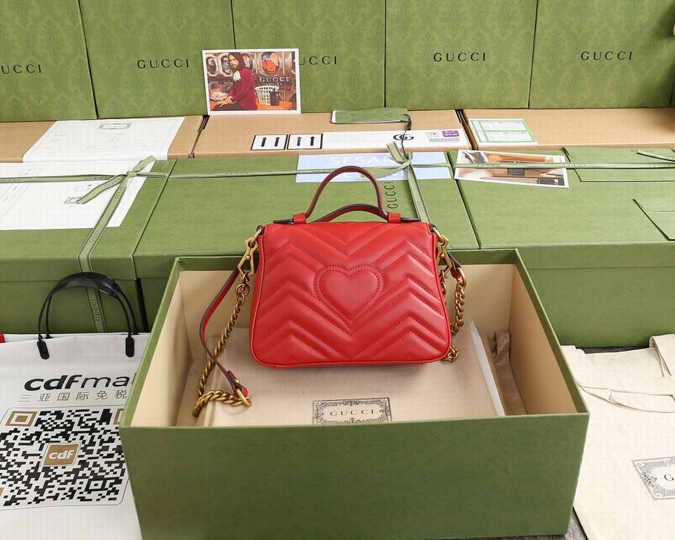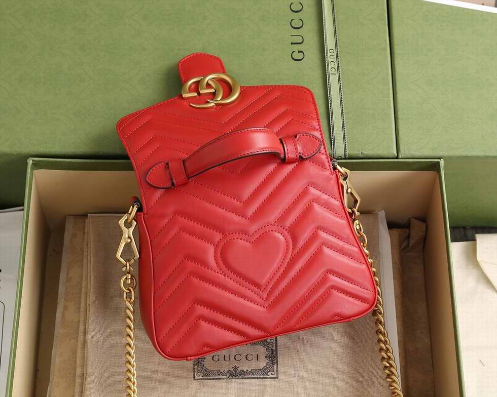 The mini GG Marmont top handle bag has a softly structured shape and an oversized flap closure with Double G hardware. Equipped with a leather top handle and chain shoulder strap, made in matelass?� chevron leather with a heart on the back.
