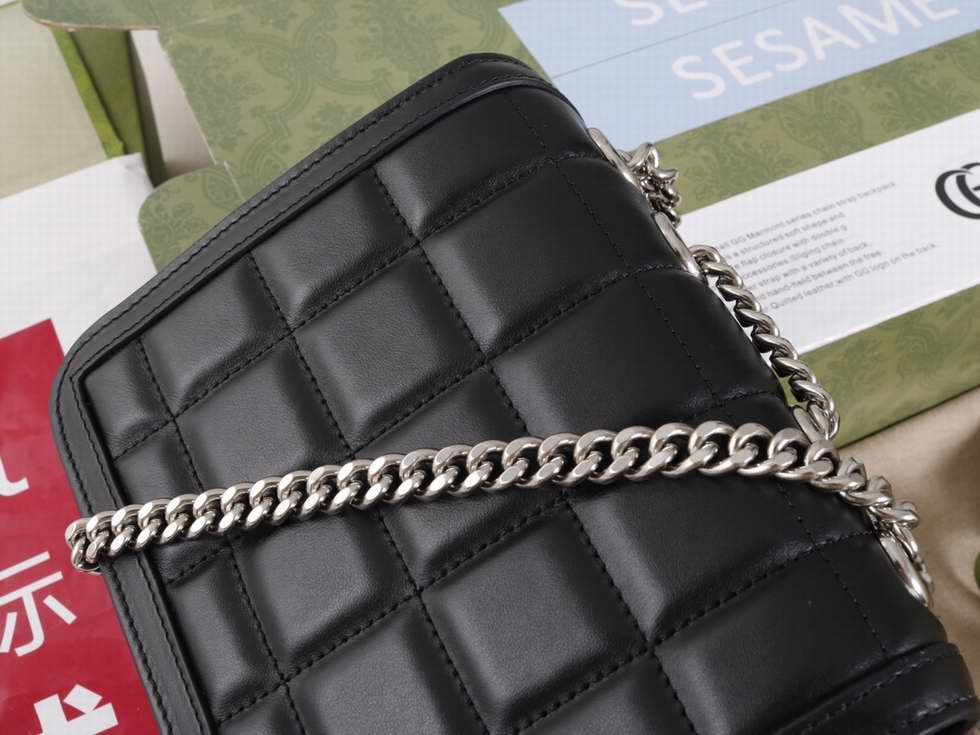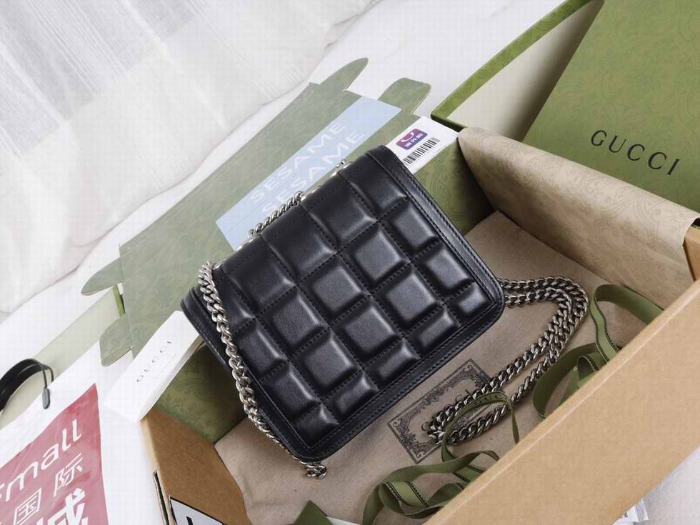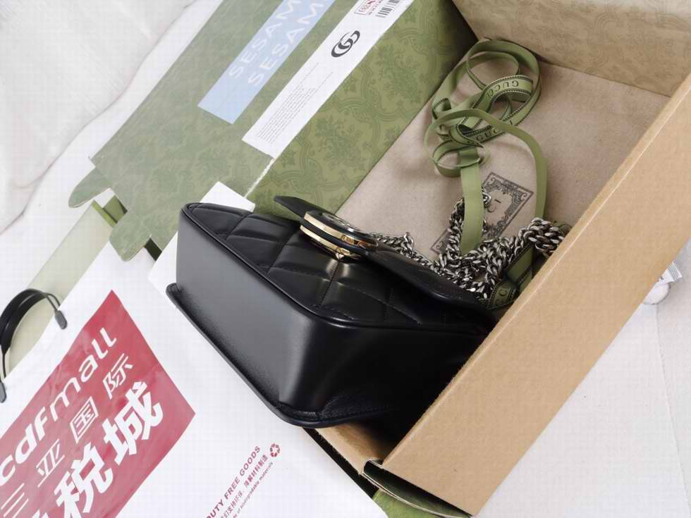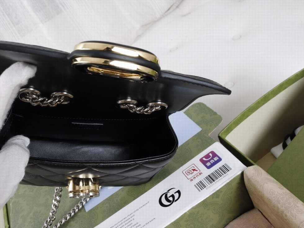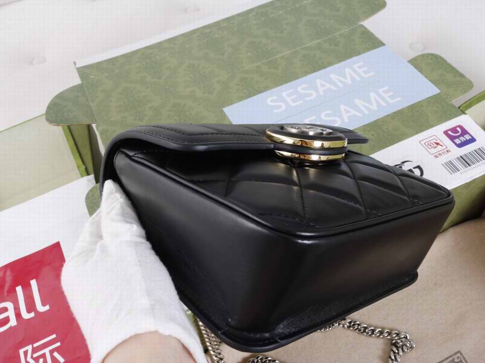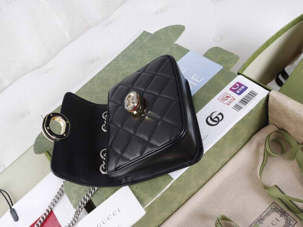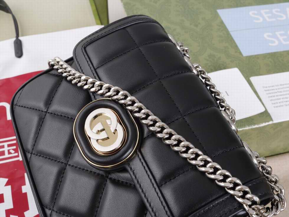 This striking shoulder bag explores classic silhouettes and refined materials. A quilted design plays with geometric shapes, highlighting emblematic symbols from the archive for a truly retro feel. The Interlocking G hardware makes a strong style statement, contrasting with the tonal 1970s inspired leather trim.