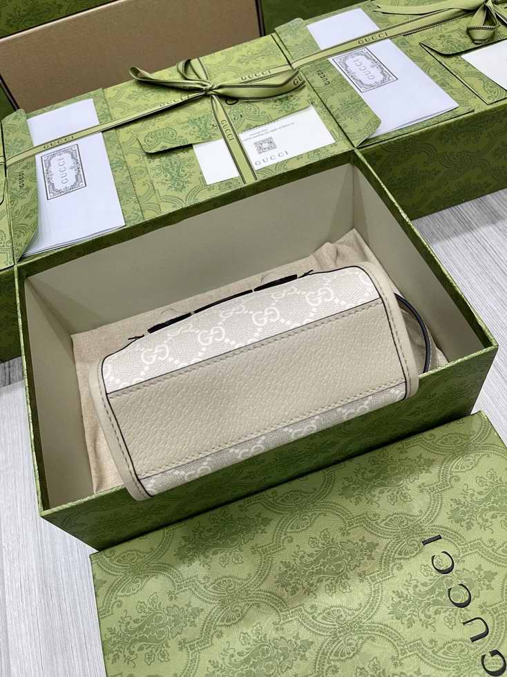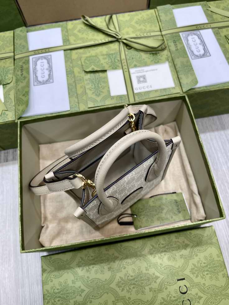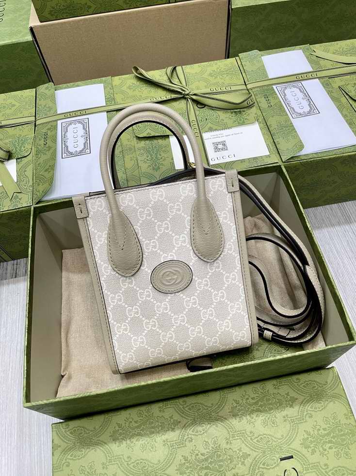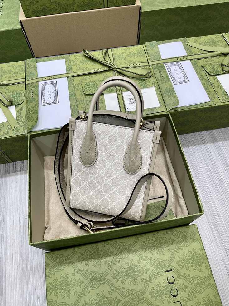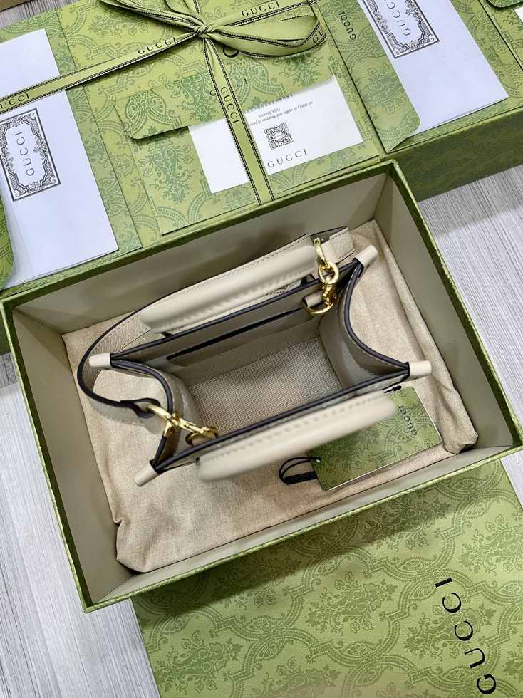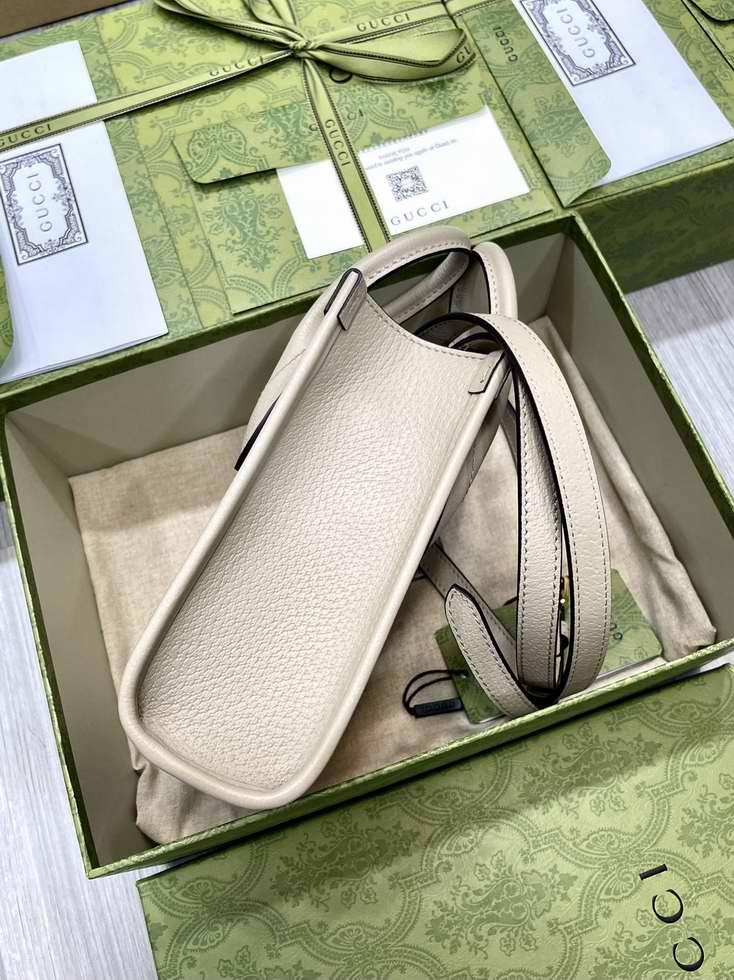 An archival design from the 1930s inspired the GG Supreme canvas, now one of the House's most emblematic materials. Traditionally presented in beige and ebony, it appears here in a beige and white combination, an ode to timeless pieces and everlasting design. The mini tote bag is complete with an oatmeal leather trim and an Interlocking G tag.