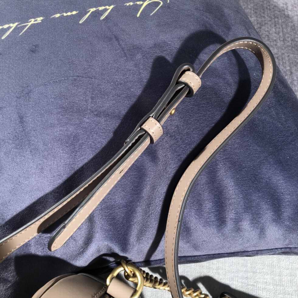 The small GG Marmont chain shoulder bag has a softly structured shape and a zip top closure with the Double G hardware. The chain shoulder strap has a leather shoulder detail. Made in matelasse leather with a chevron design.