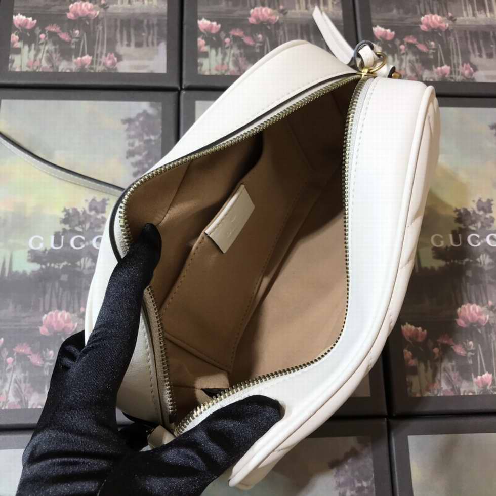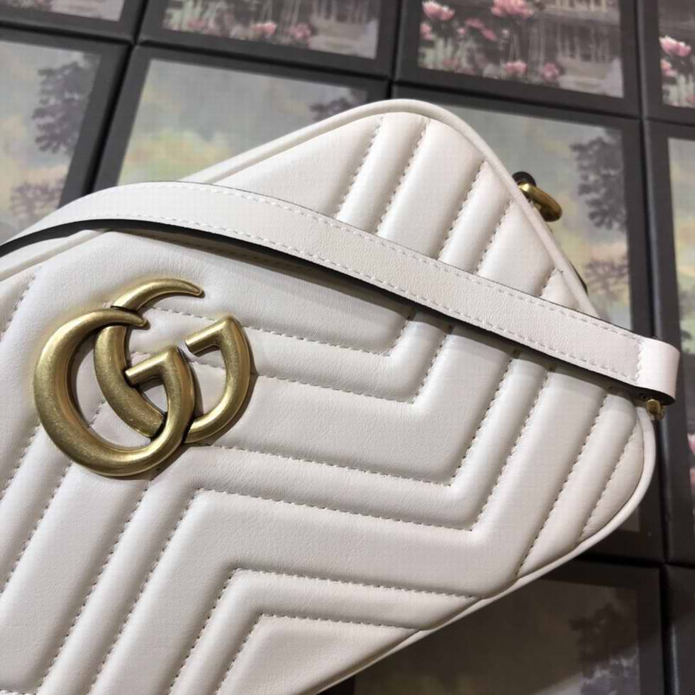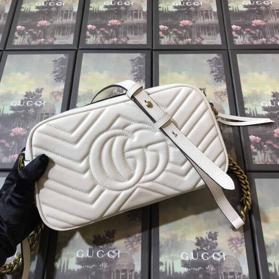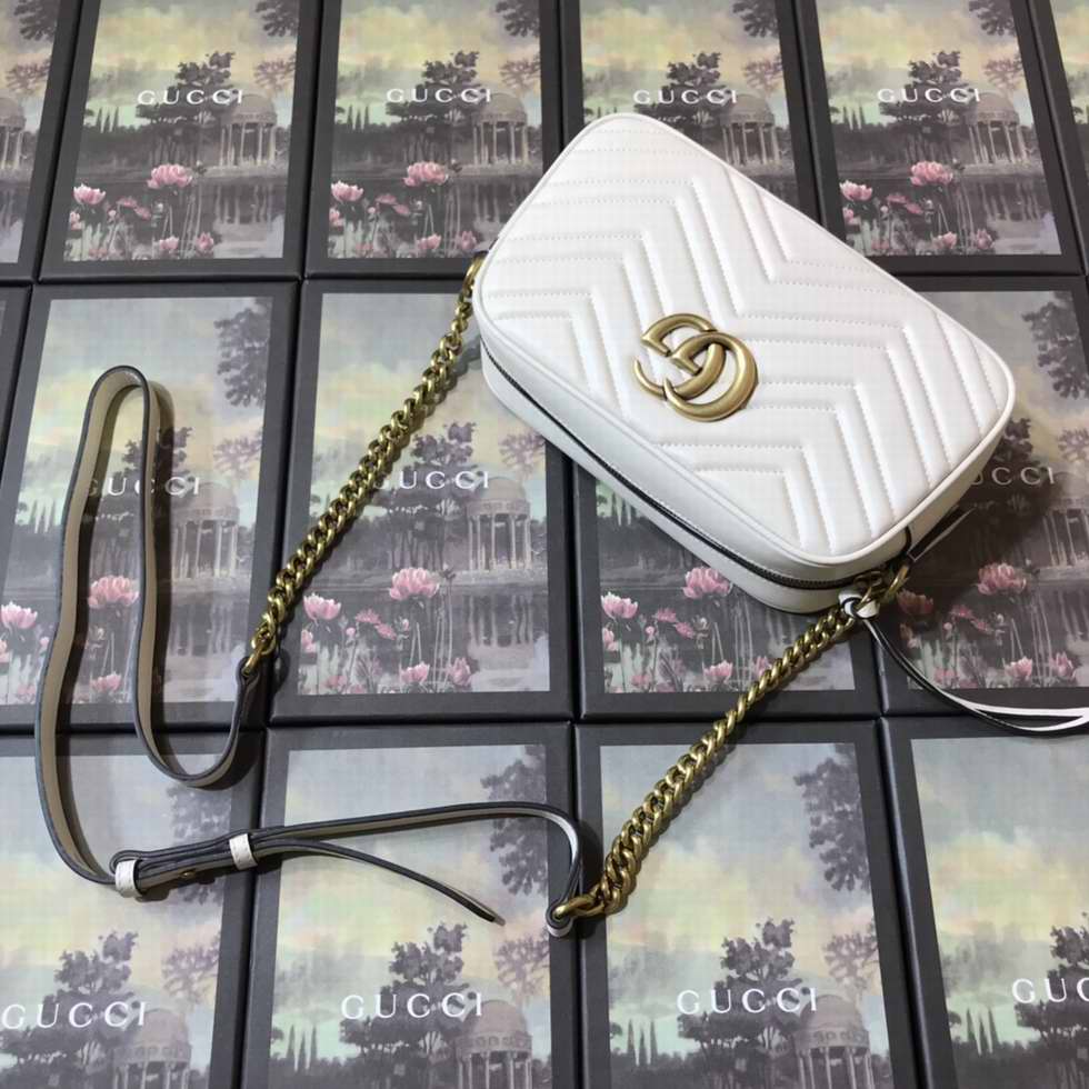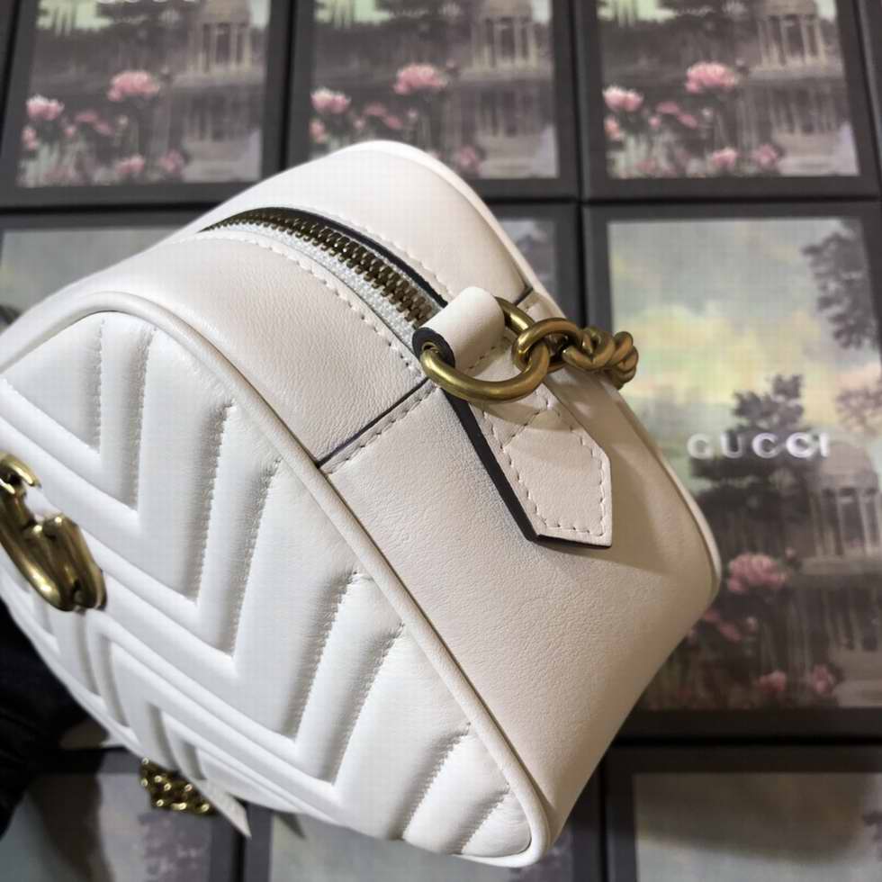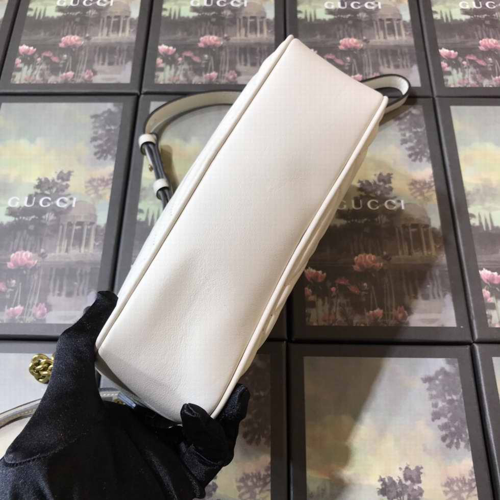 The small GG Marmont chain shoulder bag has a softly structured shape and a zip top closure with the Double G hardware. The chain shoulder strap has a leather shoulder detail. Made in matelasse leather with a chevron design.