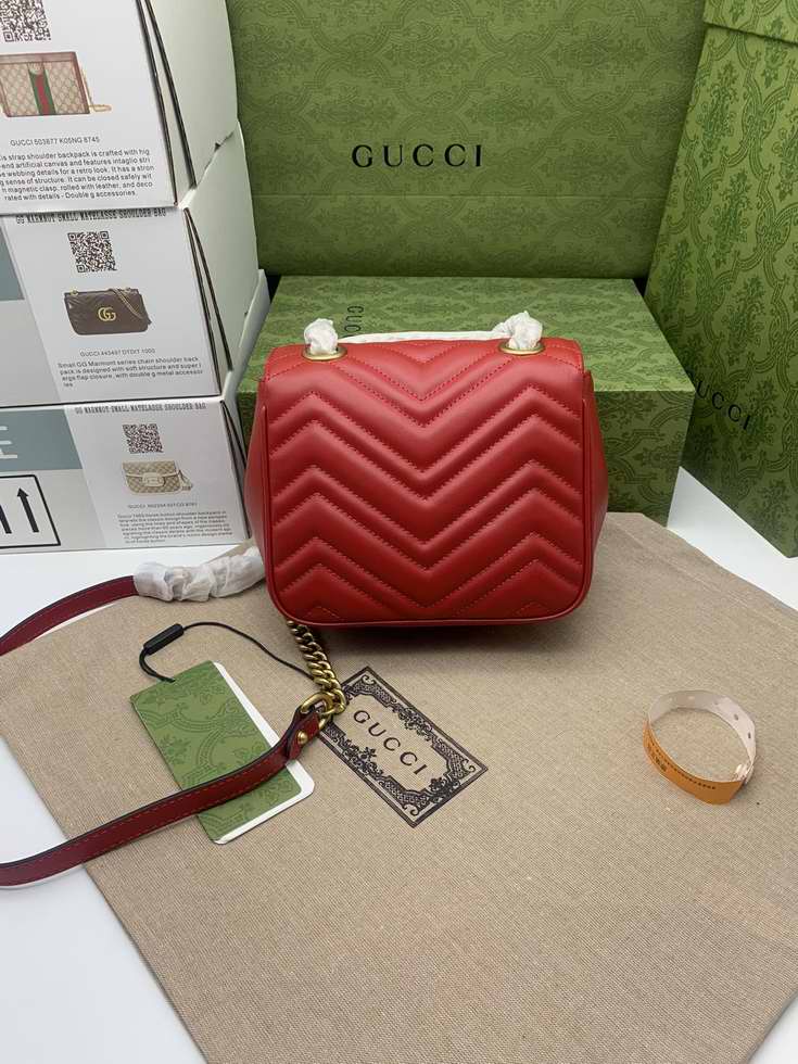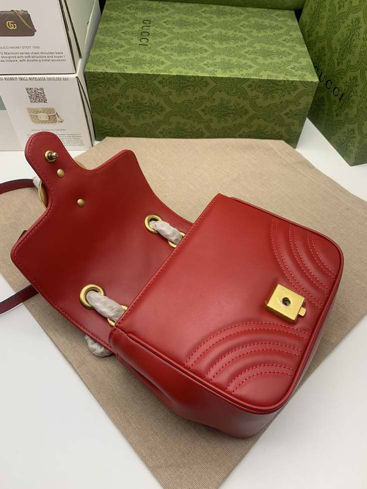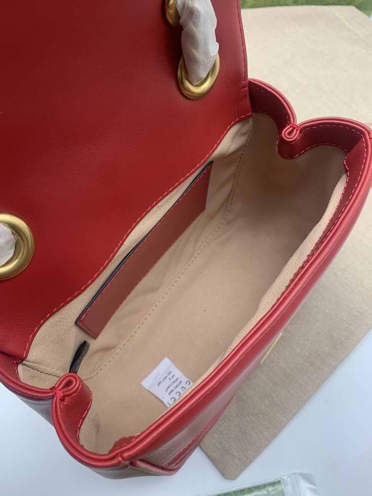 The GG Marmont has become synonymous with the House, thanks to its recognizable matelasse fabric and Double G hardware. Continuously reinvented through the seasons, new shapes are introduced within this signature line, matching Gucci's contemporary vision. Here, it's presented in red leather and further enriched with antique gold-toned details.