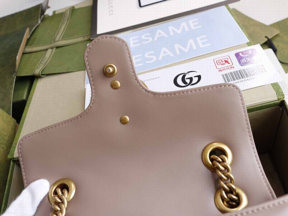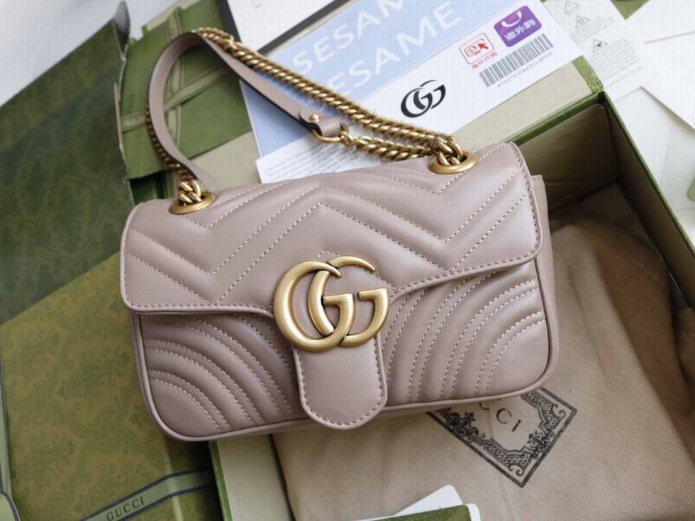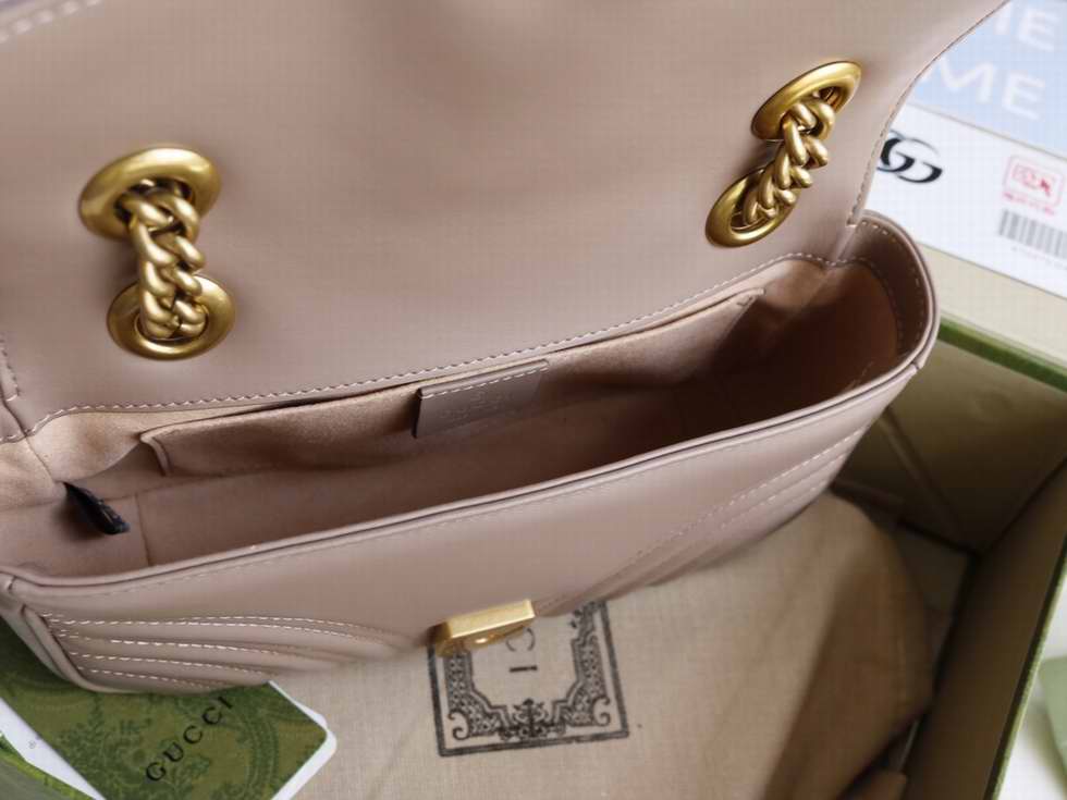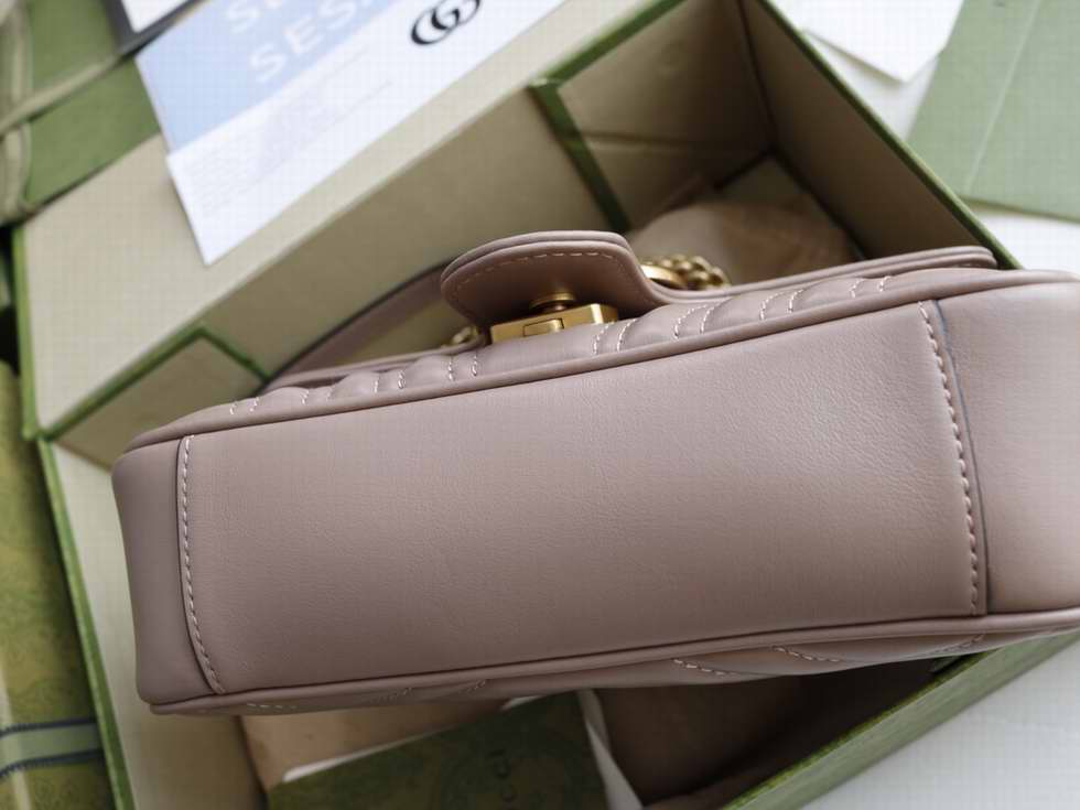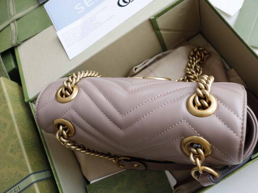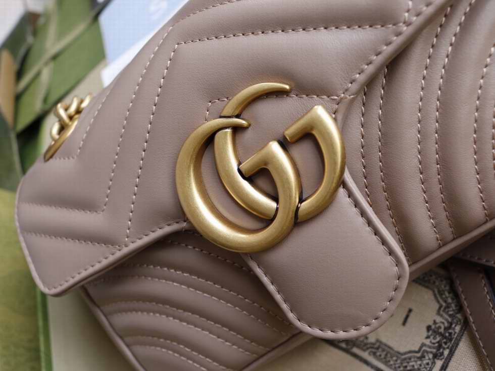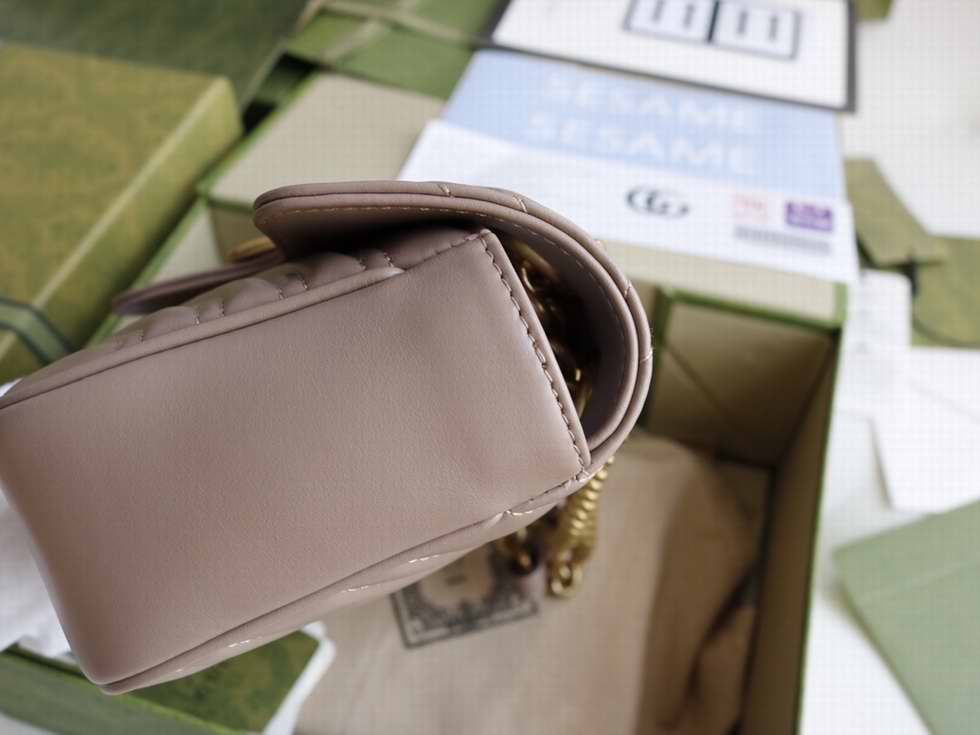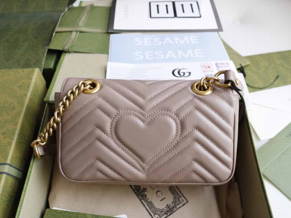 The mini GG Marmont chain shoulder bag has a softly structured shape and an oversized flap closure with Double G hardware. The sliding chain strap can be worn multiple ways, changing between a shoulder and a top handle bag. Made in matelass?� chevron leather with a heart on the back.