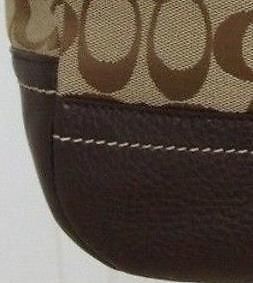 Notice the real stitching on a true Coach purse, same color thread and very well hidden, this picture is zoomed. On fakes you can see the white thread even if not zoomed in. Notice the same thing on the signature. Can you tell which one is the fake? There are many things to notice when buying a Coach and I will try to add others as I see them