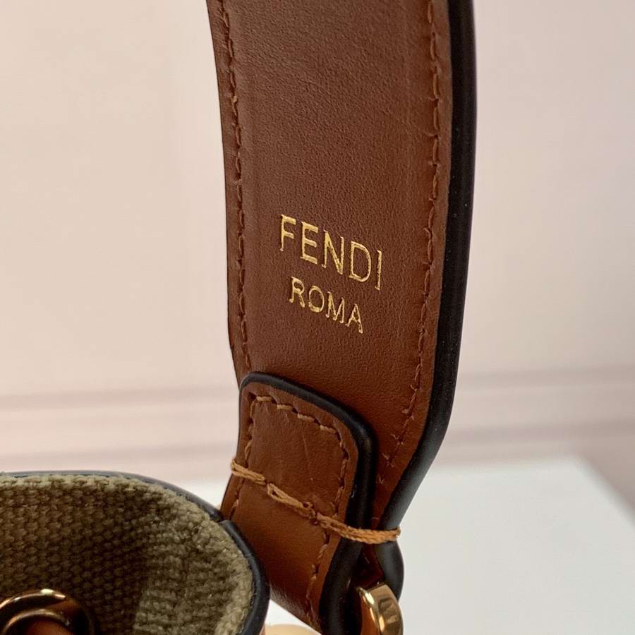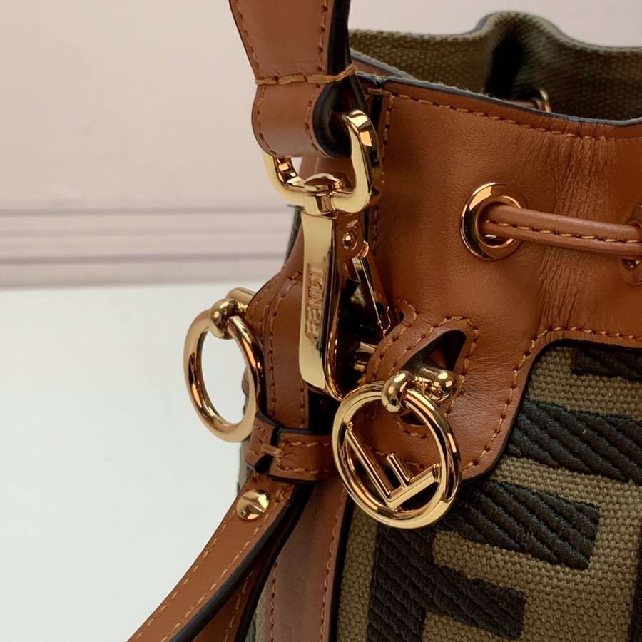 Small Mon Tresor bucket bag with drawstring fastening and metal decorations in the Fendi logo shape. Two detachable shoulder straps, one long and one short, to wear the bag over the shoulder or cross-body. Made of beige raffia. Finished with FF motif embroidered in tone-on-tone thread. Details in brown leather. Gold-finish metalware.