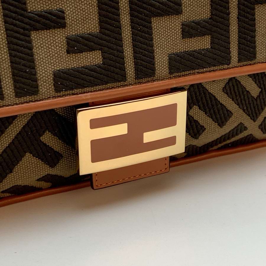 Iconic medium Baguette bag, made of beige canvas with an FF motif embroidered in multicolor yarn. Decorated with an FF clasp. Featuring a front flap, magnetic clasp, brown leather details, a lined internal compartment with a zip pocket and gold-finish metalware. The bag can be carried by hand, or worn either on the shoulder or cross-body thanks to the handle and shoulder strap, both detachable.