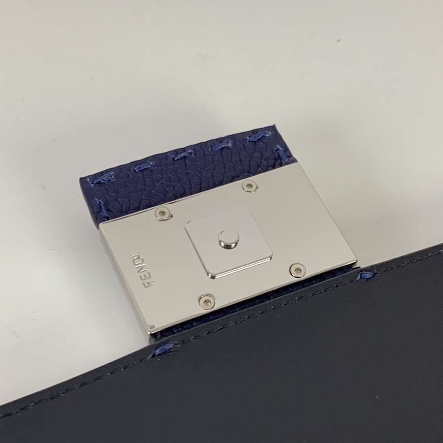 Regular Baguette with square flap and FF magnetic clasp. It can be worn either as a belt bag, using the strap that pulls out of the outer pocket on the back, or as a shoulder or cross-body bag by attaching the detachable shoulder straps. Internal zippered pocket. Made of black Romano leather. Palladium-finish metalware.
