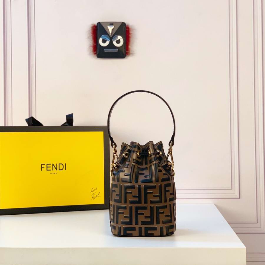 Small Mon Tresor bucket bag with drawstring fastening and metal decorations in the Fendi logo shape. Two detachable shoulder straps, one long and one short, to carry the bag by hand, over the shoulder or cross-body. Made of brown calfskin. Iconic FF pattern in raised print and hand-painted in black. Gold-finish metalware.