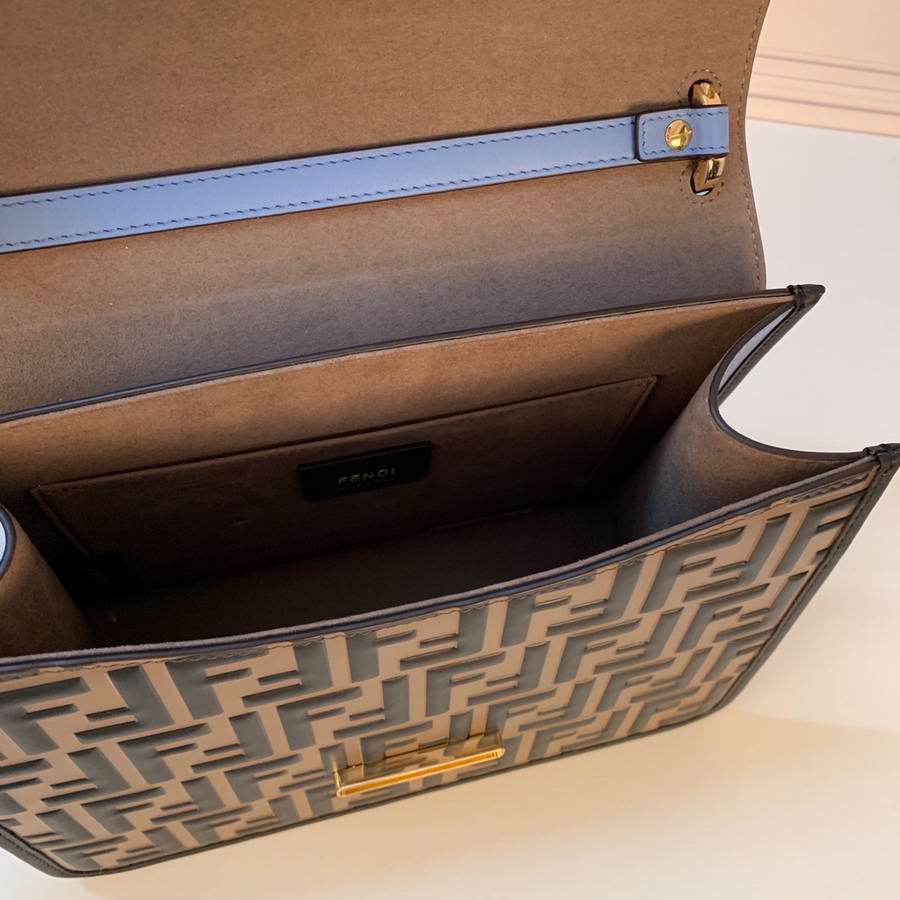 blue leather bag with flap, decorated with an F is Fendi metal logo. Embossed and hand-painted FF motif on the underside of the flap. Featuring an inside pocket, magnetic clasp and metal accessories in a mix of palladium and gold finishes. Can be worn cross-body or carried by hand thanks to the detachable shoulder strap.