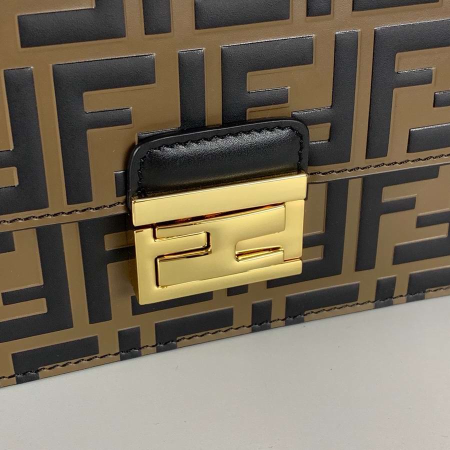 Mini-bag with flap made of leather with embossed FF motif hand-painted in brown and black. Decorated with iconic FF press fastening. Featuring two gusseted compartments separated by a stiff partition, with an inner pocket and gold-finish metalware. Can be worn cross-body or carried by hand thanks to the detachable shoulder strap.