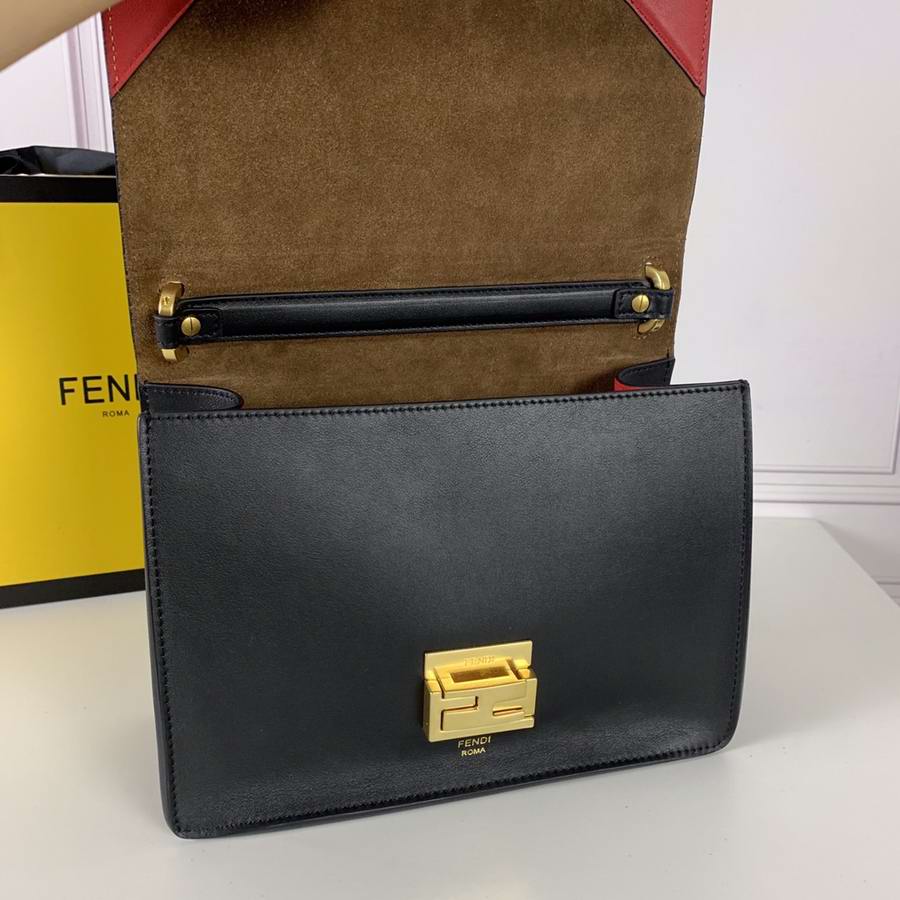 Geometric bag made of matte black leather, with the flap embellished with embossed corners and iconic FF press fastening.