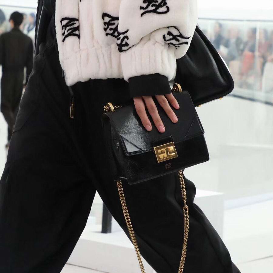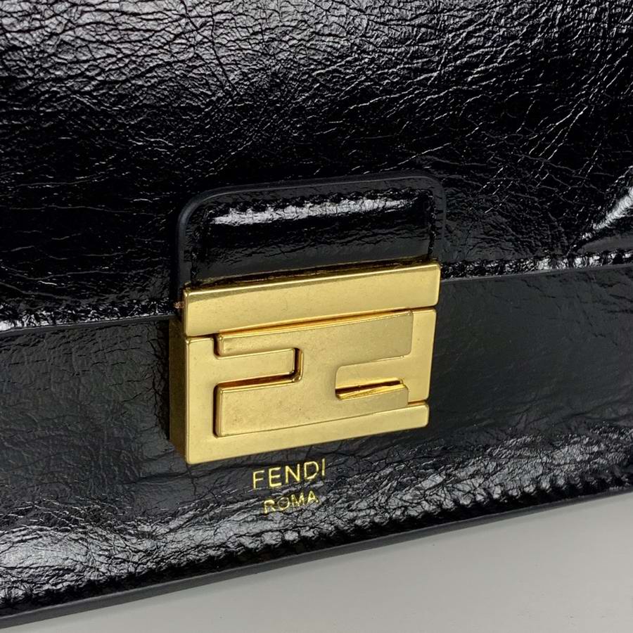 Geometric bag made of matte black leather, with the flap embellished with embossed corners and iconic FF press fastening. Featuring a gusseted interior compartment, flat inner pocket and gold-finish metalware. Can be worn either on the shoulder or cross-body thanks to the double detachable shoulder straps, one long and adjustable and one short with a chain.