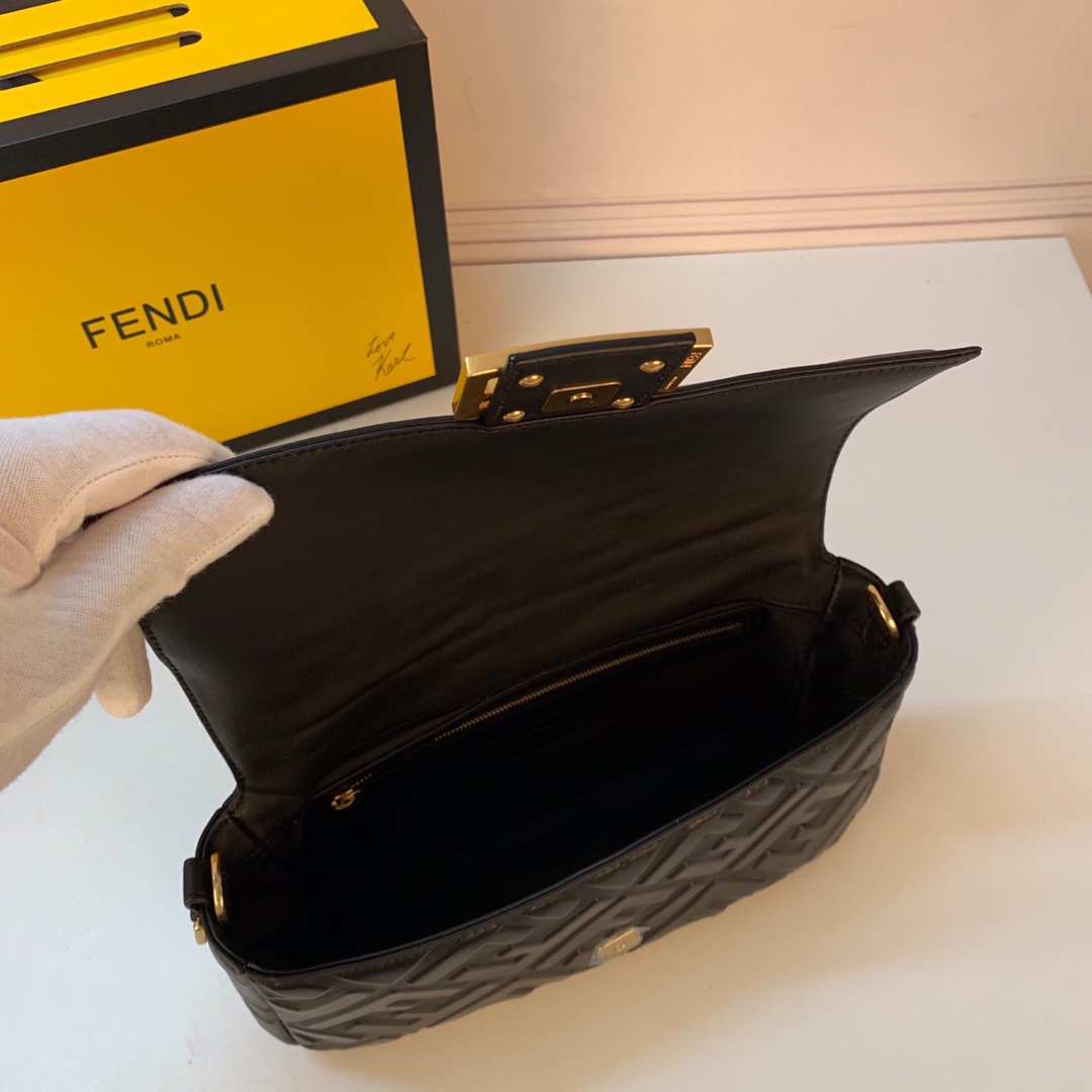 Iconic mini Baguette bag made of black soft nappa leather with a three-dimensional texture FF motif. Decorated with an FF clasp.