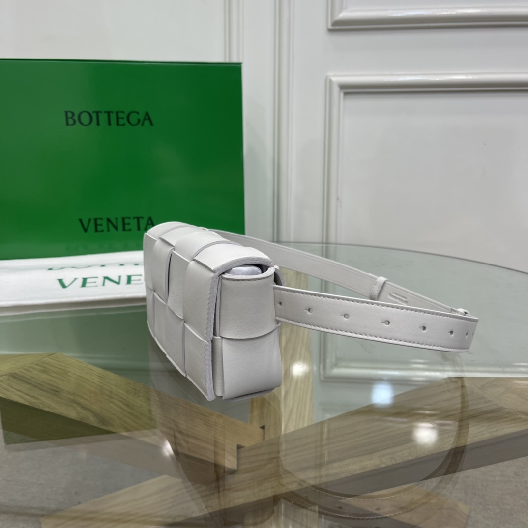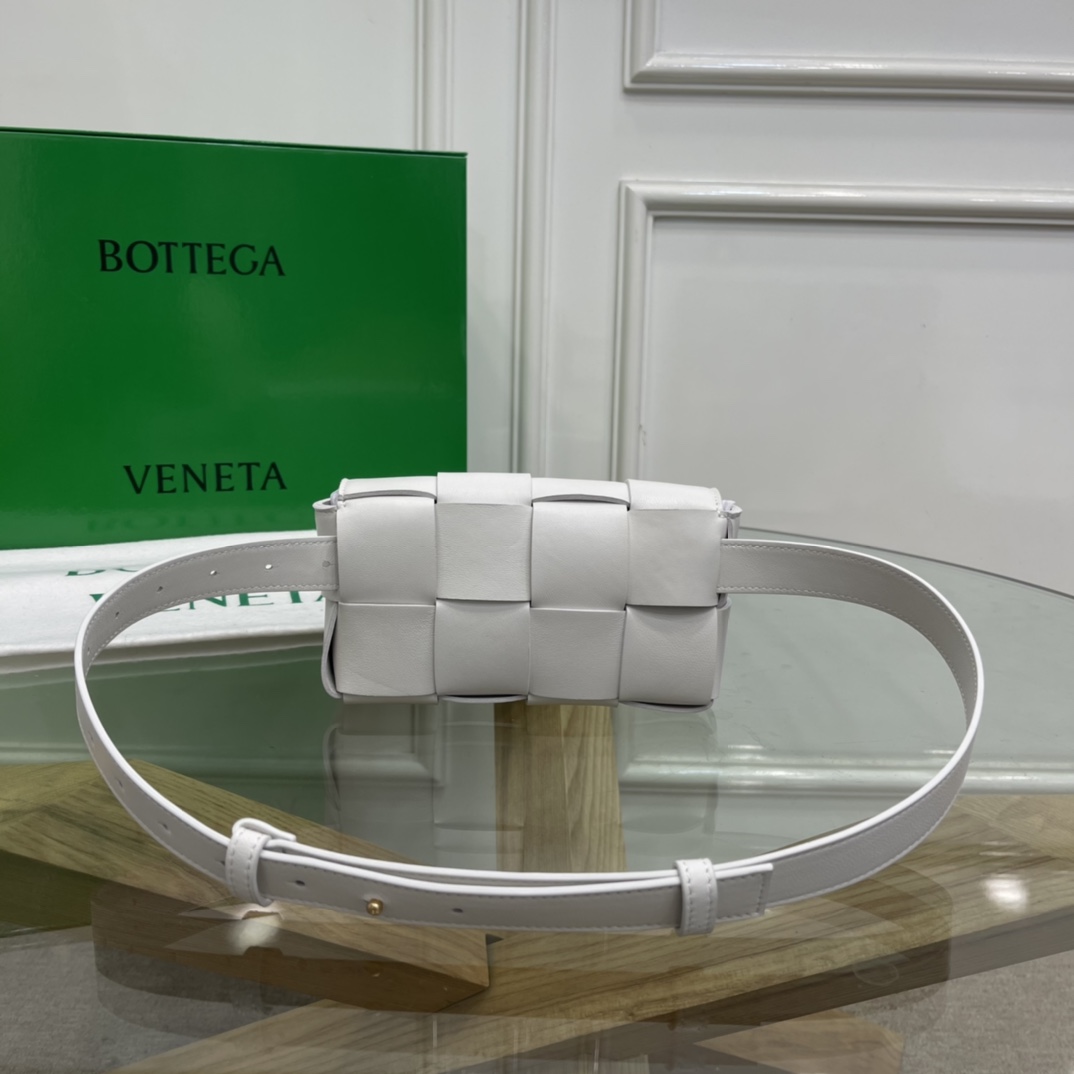 Cassette belt bag in Intrecciato Nappa leather One interior flat pocket Adjustable belt with 15 holes and a pin fastening Magnetic closure Nappa interior