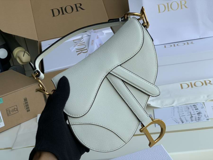 Maria Grazia Chiuri brings a fresh update to the iconic Saddle bag. The heritage design showcases the emblematic 'D'-stirrup magnetic clasp and Saddle flap with the signature 'CD' structure on both sides of the handle. Crafted in white grained calfskin and embellished with antique gold-finish metal hardware, the modern style may be customized with alternative straps.