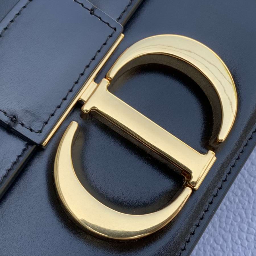 The 30 Montaigne line, inspired by the historic, emblematic address, presents essential pieces that portray the iconic codes of the House. The handbag is crafted in black box calfskin for an elegant and timeless look. The flap is embellished with an antique gold-finish metal 'CD' clasp. Refined details such as an embossed '30 Montaigne' signature on the back and the softer calfskin sides spotlight the sleek, meticulous design.