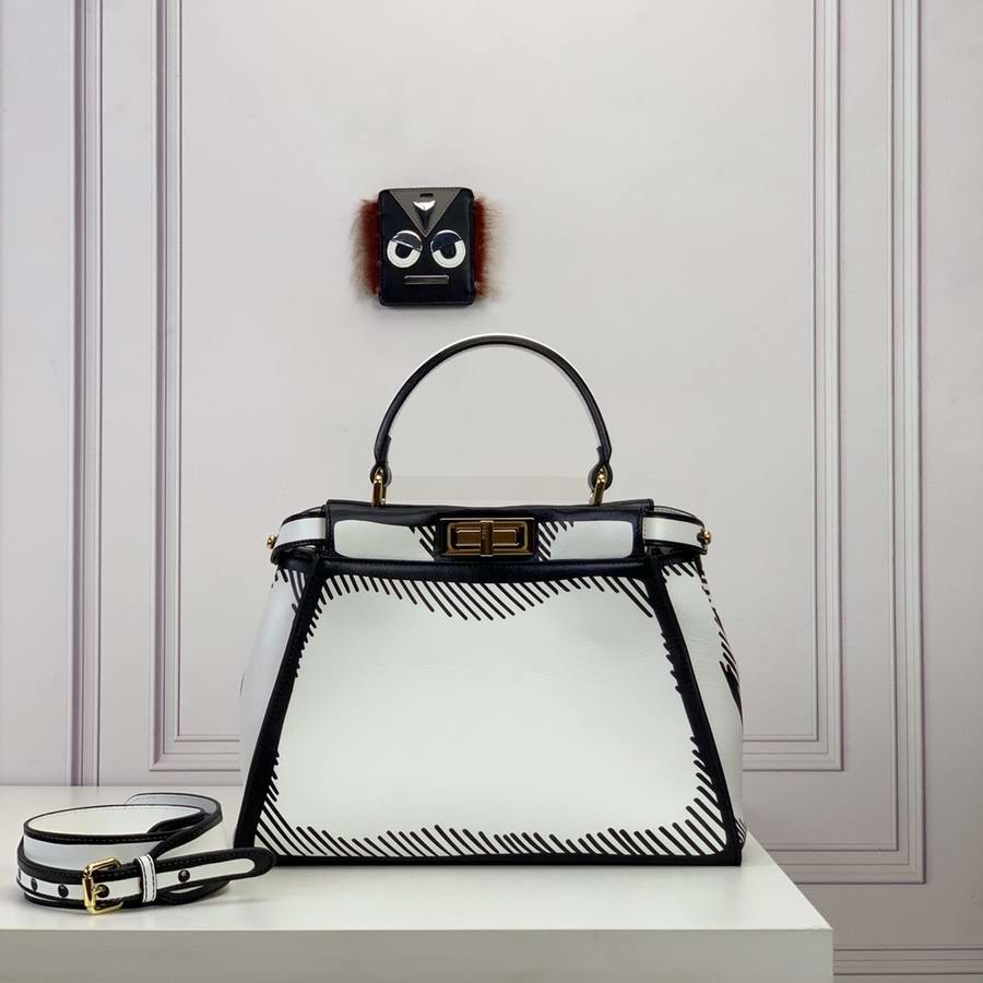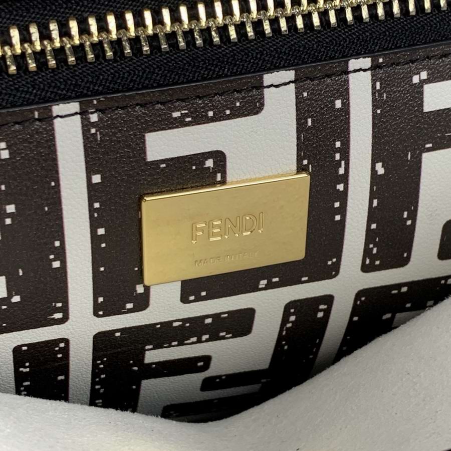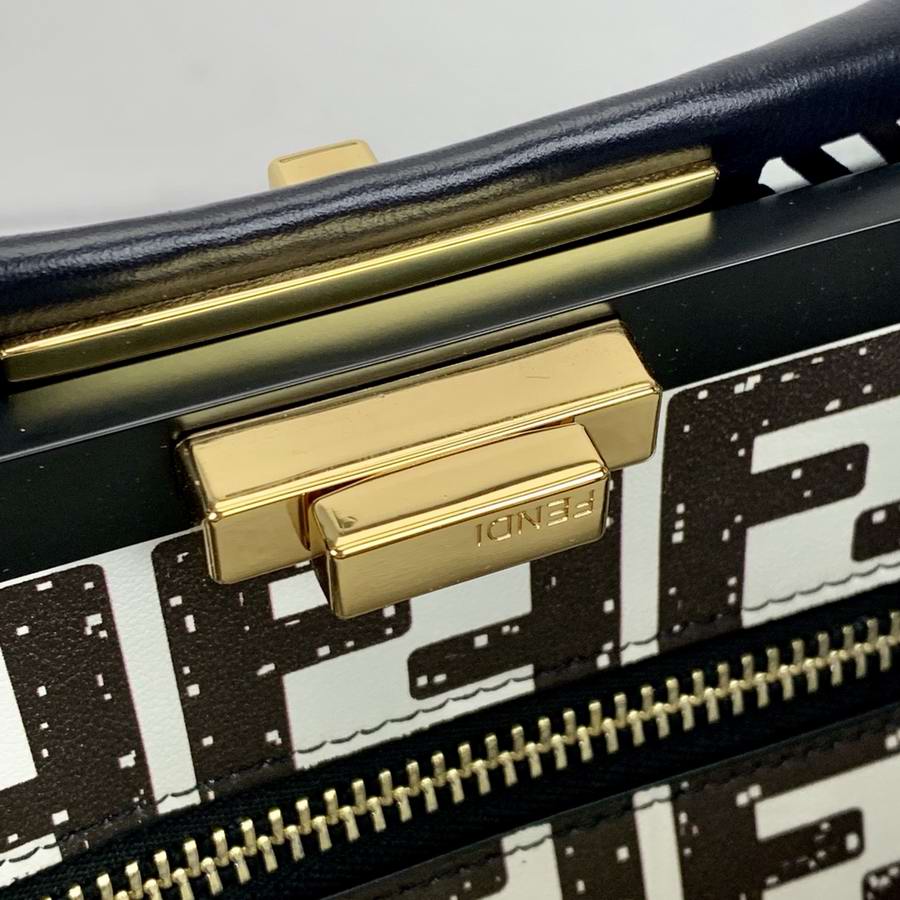 Iconica borsa Peekaboo misura media, realizzata in pelle color bianco e decorata con l'iconica chiusura a girello su entrambi i lati. Dotata di interni rifiniti in tessuto bianco con ricamo FF a contrasto di color nero, due scompartimenti interni divisi da una tramezza rigida, una tasca interna con zip, accessori metallici con finitura dorata. Pu?� essere portata a mano, a spalla o cross-body grazie al manico e alla tracolla regolabile e rimovibile.