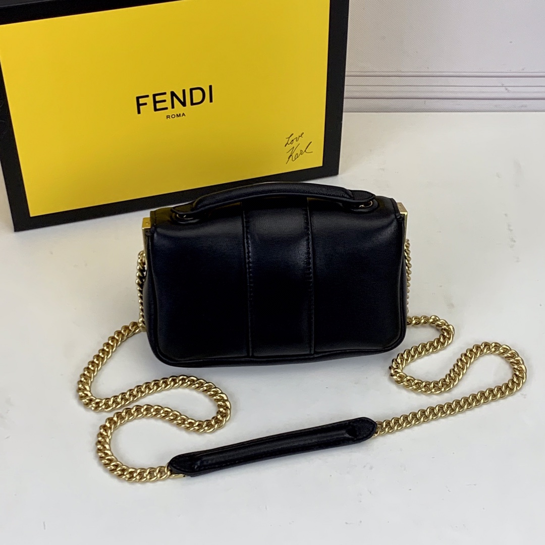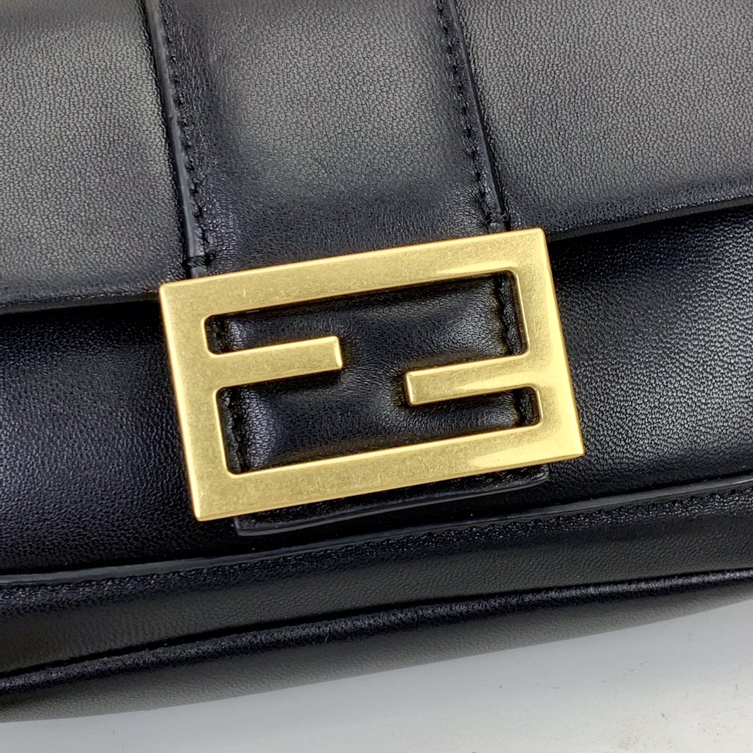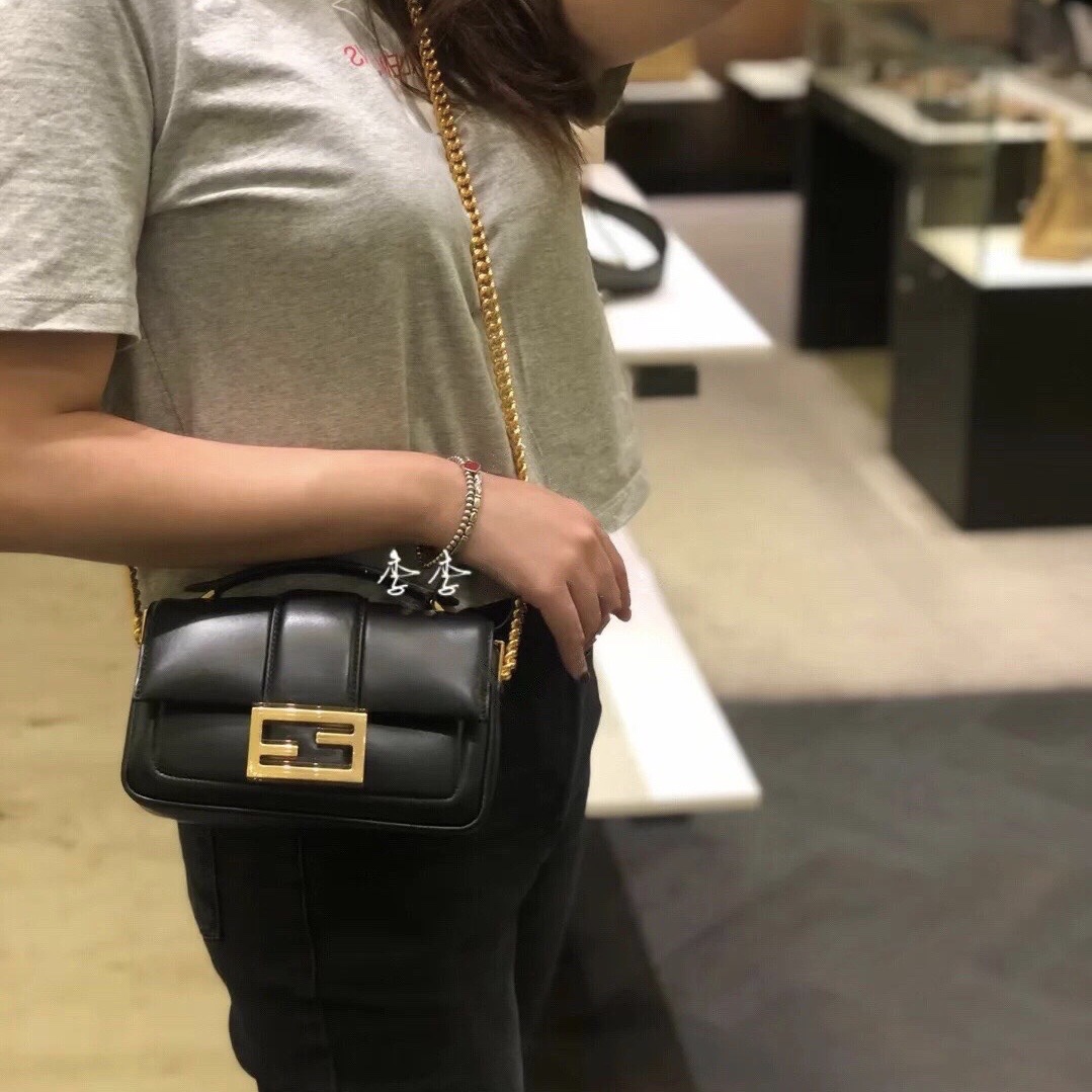 Mini Baguette bag, made of soft, black nappa leather with sliding chain and decorated with an FF clasp.