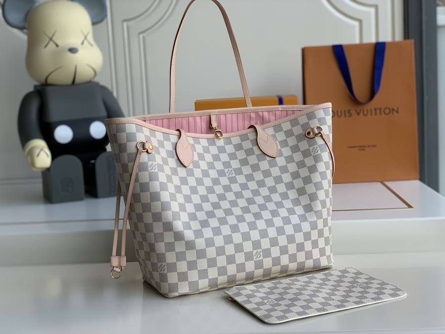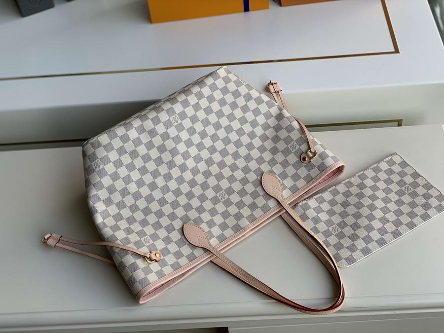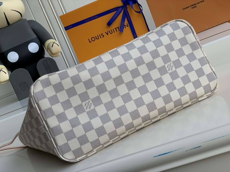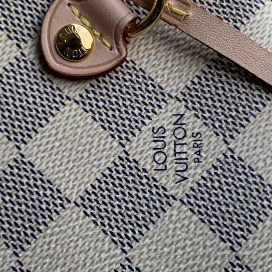 The Neverfull MM tote unites timeless design with heritage details. Made from fresh Damier Azur canvas with natural cowhide trim, it is roomy yet not bulky, with side laces that cinch for a sleek allure or loosen for a casual look. The slim leather handles slip easily over the shoulder or arm. Lined in colourful textile, it features a removable pouch that can be used as a clutch or an extra pocket.