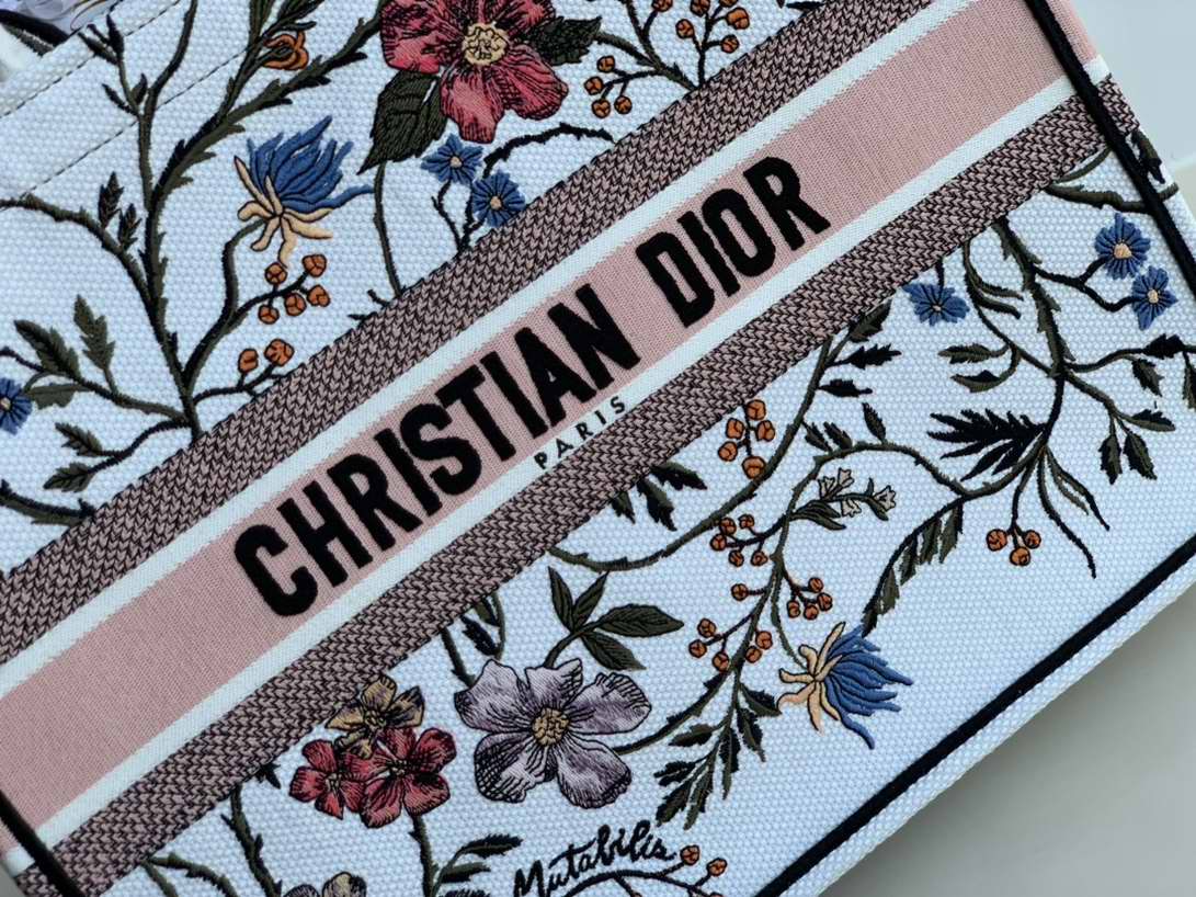 The Dior Book Tote, an original style introduced by Creative Director Maria Grazia Chiuri, has become a staple of the Dior aesthetic. This small beige style, fully embroidered with the multicolor Dior Hibiscus motif accented with metallic thread, is reminiscent of bucolic Apulian landscapes, a central theme of the collection. Adorned with the 'Christian Dior' signature, the Dior Book Tote exemplifies the House's signature savoir-faire and can be paired with other Dior Hibiscus creations from the collection.