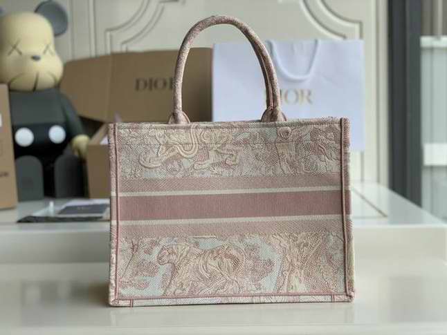 The Dior Book Tote, an original style introduced by Creative Director Maria Grazia Chiuri, has become a staple of the Dior aesthetic. Ideally designed to carry all your daily essentials, the small shape is fully embroidered with a pink Toile de Jouy motif. It features the 'Christian Dior' signature on one side and 'Cannes' on the other, suggestive of an invitation to travel. This carryall is a perfect example of the Dior savoir-faire and may be coordinated with a pouch or other small leather goods for a complete look.