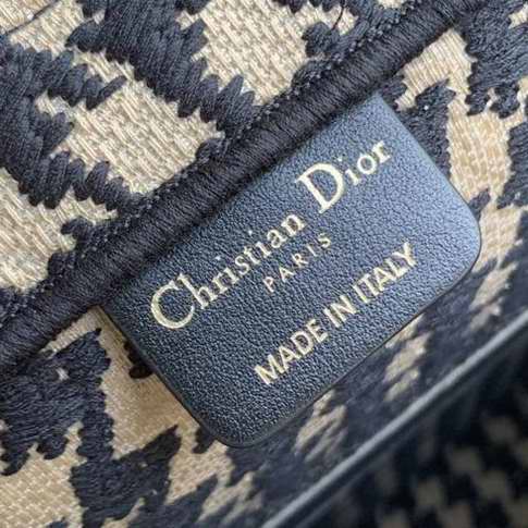 The Dior Book Tote, an original style introduced by Christian Dior's Creative Director, Maria Grazia Chiuri, has become a staple of the Dior aesthetic. Ideally designed to carry all your daily essentials, the large shape features a full houndstooth embroidery, with a cream ?�Christian Dior?? signature on the front. This carryall is a perfect example of the Dior savoir-faire and it may be worn with other small accessories or the Mitzah scarf for a complete look.