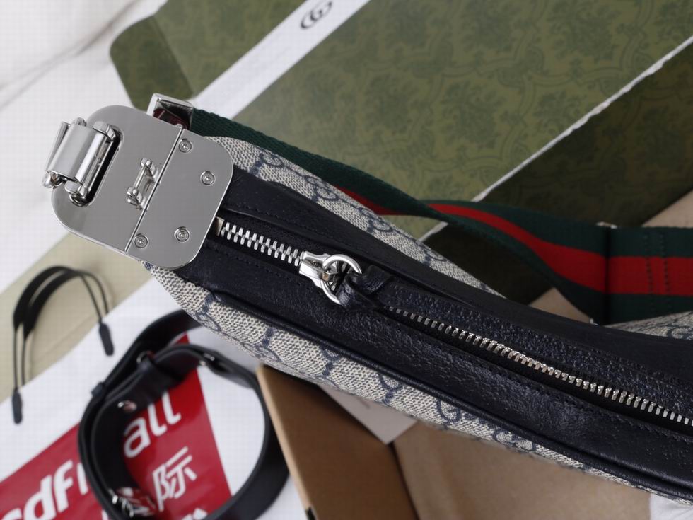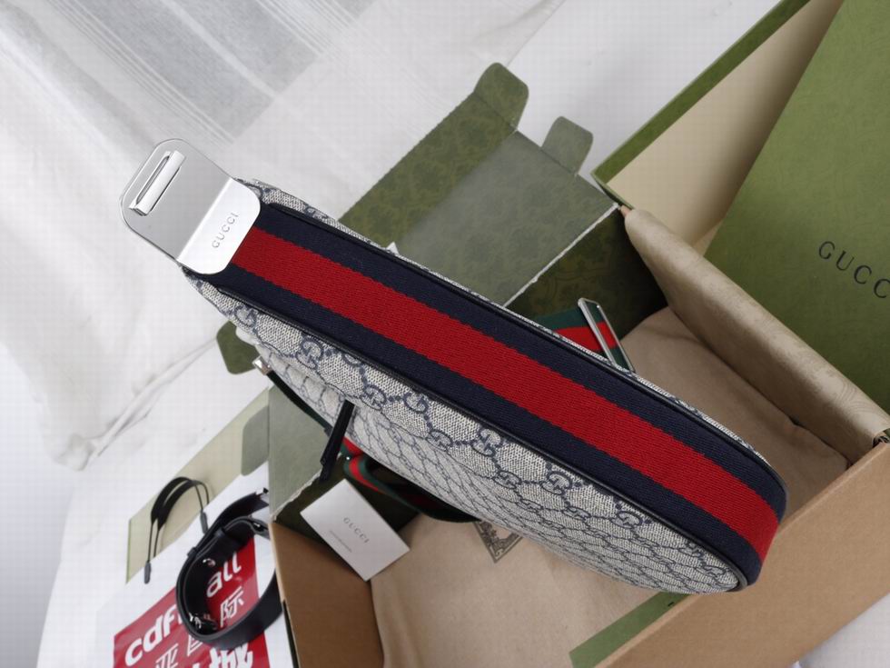 An ode to the timeless Hollywood glamour that shaped Gucci Love Parade, classic elements from the House's archives are reintroduced. Distinguished by its crescent moon shape, the accessory is further defined by a G shaped hook closure. Paired with soft materials, the heritage hardware creates a refined design with vintage appeal. This large version is crafted from beige and blue GG Supreme canvas, complete with a blue and red Web trim.
