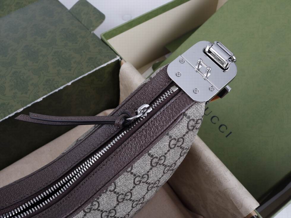 An ode to the timeless Hollywood glamour that shaped Gucci Love Parade, classic elements from the House's archives are reintroduced. Distinguished by its crescent moon shape, the accessory is further defined by a G shaped hook closure. Paired with soft materials, the heritage hardware creates a refined design with vintage appeal. This large version is crafted from beige and ebony GG Supreme canvas, complete with a green and red Web trim.