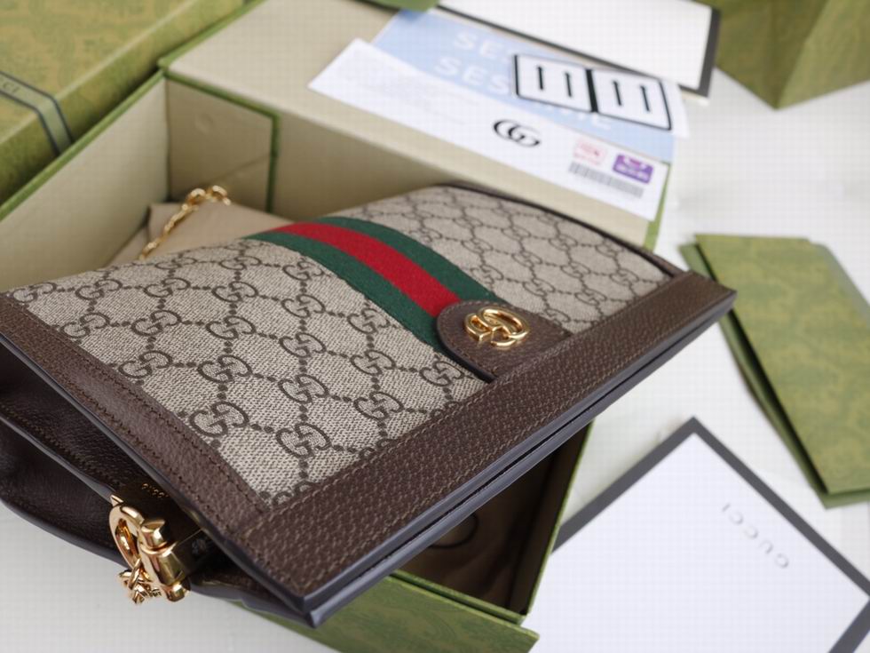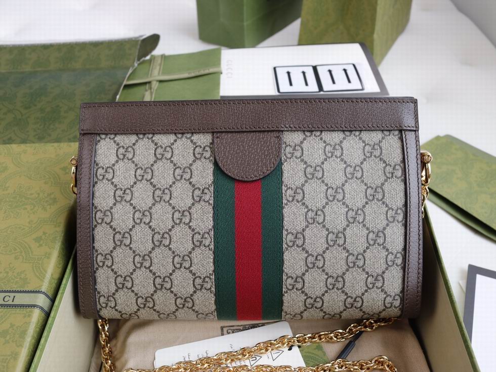 Crafted in GG Supreme canvas with inlaid Web stripe detail, the chain strap shoulder bag boasts a vintage inspired design. The structured shape secures with a magnetic closure, trimmed with leather and Double G hardware??an archival detail.