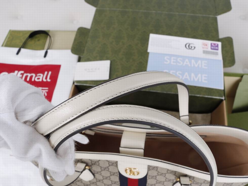 A classic combination of the House's most defining codes??the GG motif and Web stripe??the world of Ophidia continues to evolve, incorporating new shapes and silhouettes each season. With recognizable design elements in a practical new shape, this new medium sized tote is trimmed with textured leather and topped with Double G hardware. Thanks to its long leather handles, the style can also be carried as a shoulder bag.