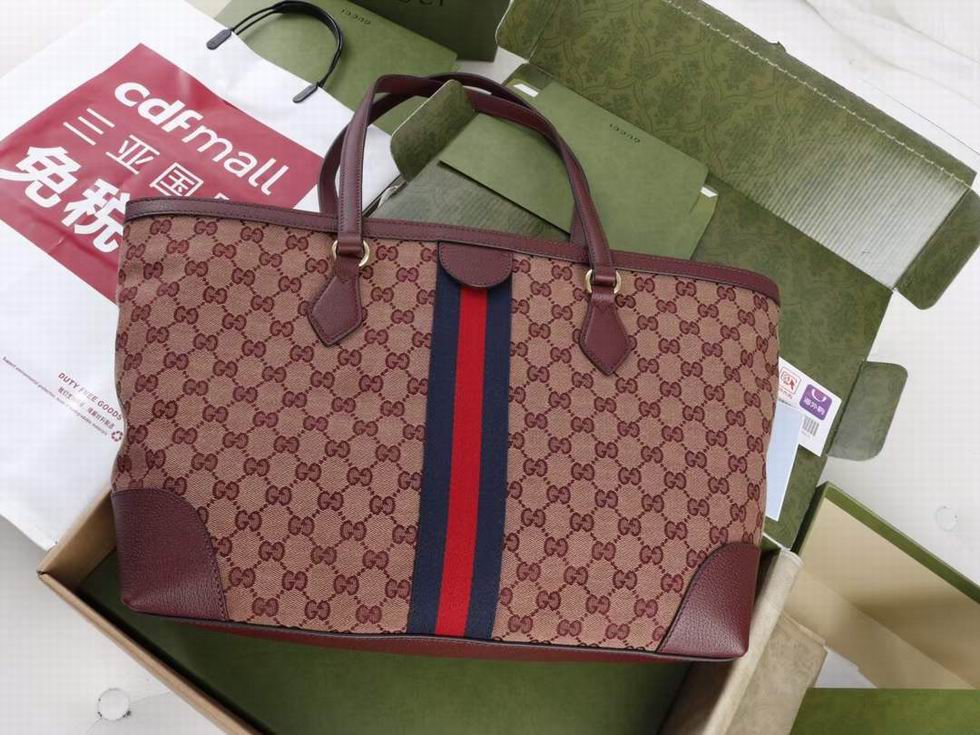 A classic combination of the House's most defining codes??the GG motif and Web stripe??the world of Ophidia continues to evolve, incorporating new shapes and silhouettes each season. With recognizable design elements in a practical new shape, this new medium sized tote is trimmed with textured leather and topped with Double G hardware. Thanks to its long leather handles, the style can also be carried as a shoulder bag.