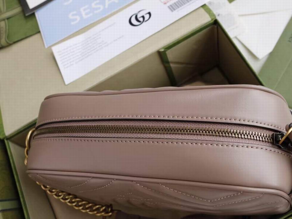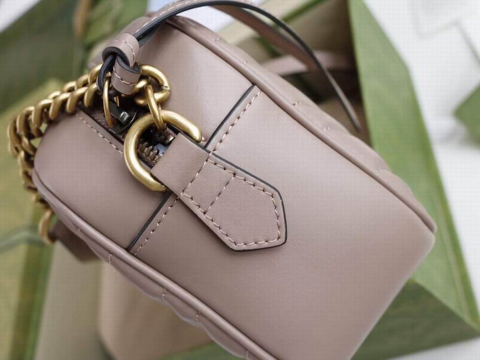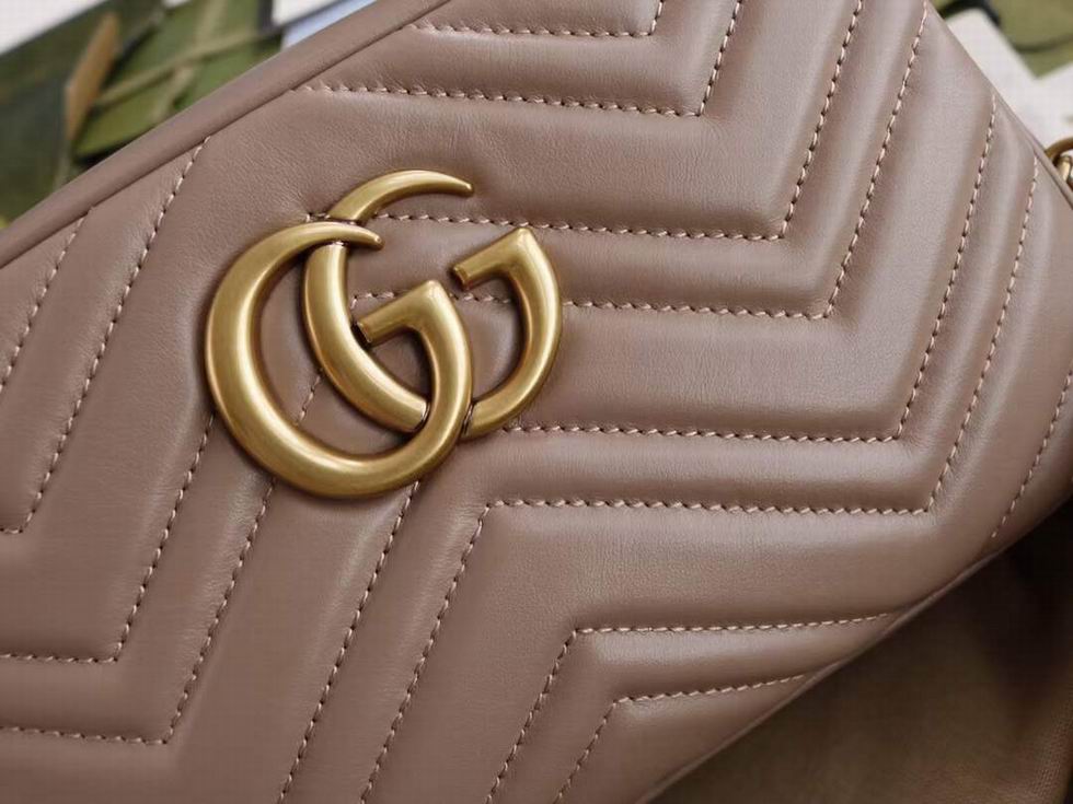 The small GG Marmont chain shoulder bag has a softly structured shape and a zip top closure with the Double G hardware. The chain shoulder strap has a leather shoulder detail. Made in matelass?� leather with a chevron design.