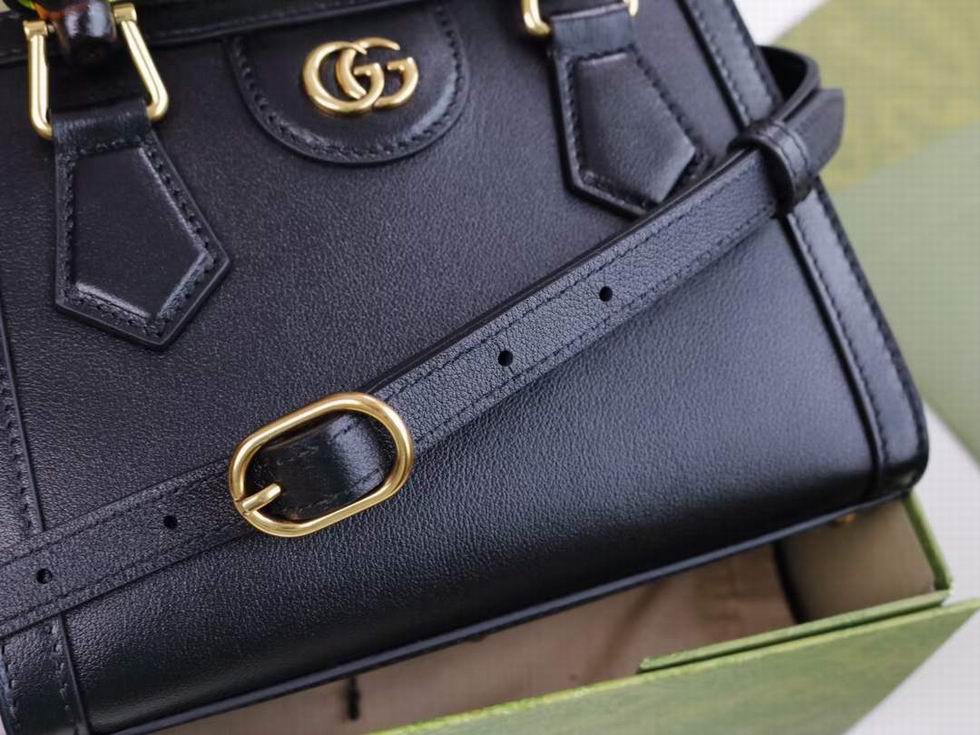 Instantly recognizable emblems of the brand, logos enrich designs in new and unexpected ways. Behind every logo lies the tradition and value of the House, an everlasting medium one can wear again and again. Following the idea of constant change and experimentation, different iterations of the logo have been presented each collection. The jumbo GG, a new, maximalist version of the historic monogram, animates a selection of ready-to-wear and accessories for the Aria collection. This mini Gucci Diana tote is completed by a brown leather trim.