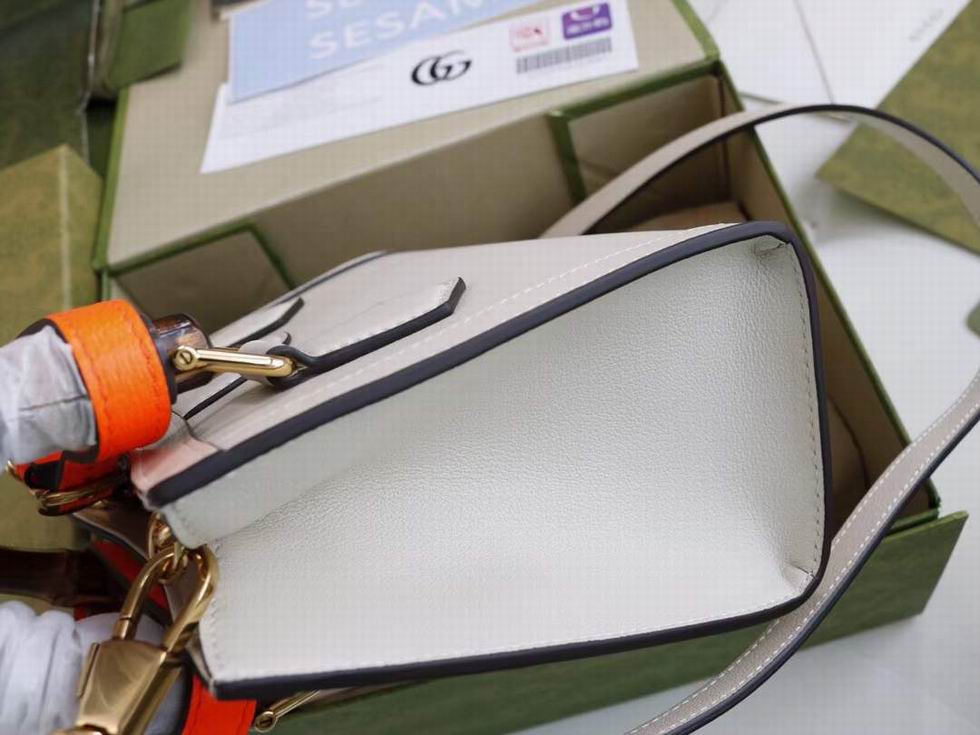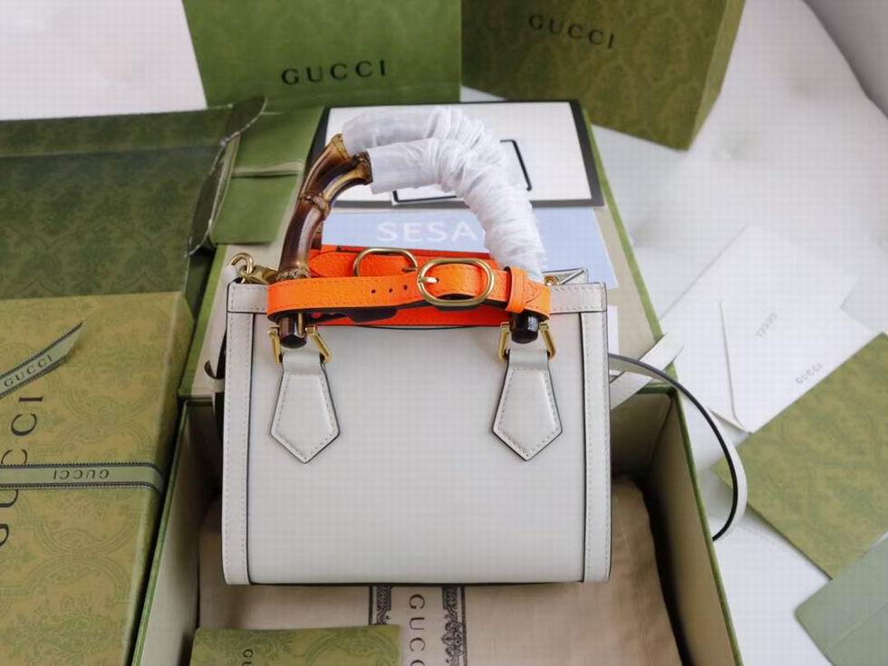 Instantly recognizable emblems of the brand, logos enrich designs in new and unexpected ways. Behind every logo lies the tradition and value of the House, an everlasting medium one can wear again and again. Following the idea of constant change and experimentation, different iterations of the logo have been presented each collection. The jumbo GG, a new, maximalist version of the historic monogram, animates a selection of ready-to-wear and accessories for the Aria collection. This mini Gucci Diana tote is completed by a brown leather trim.