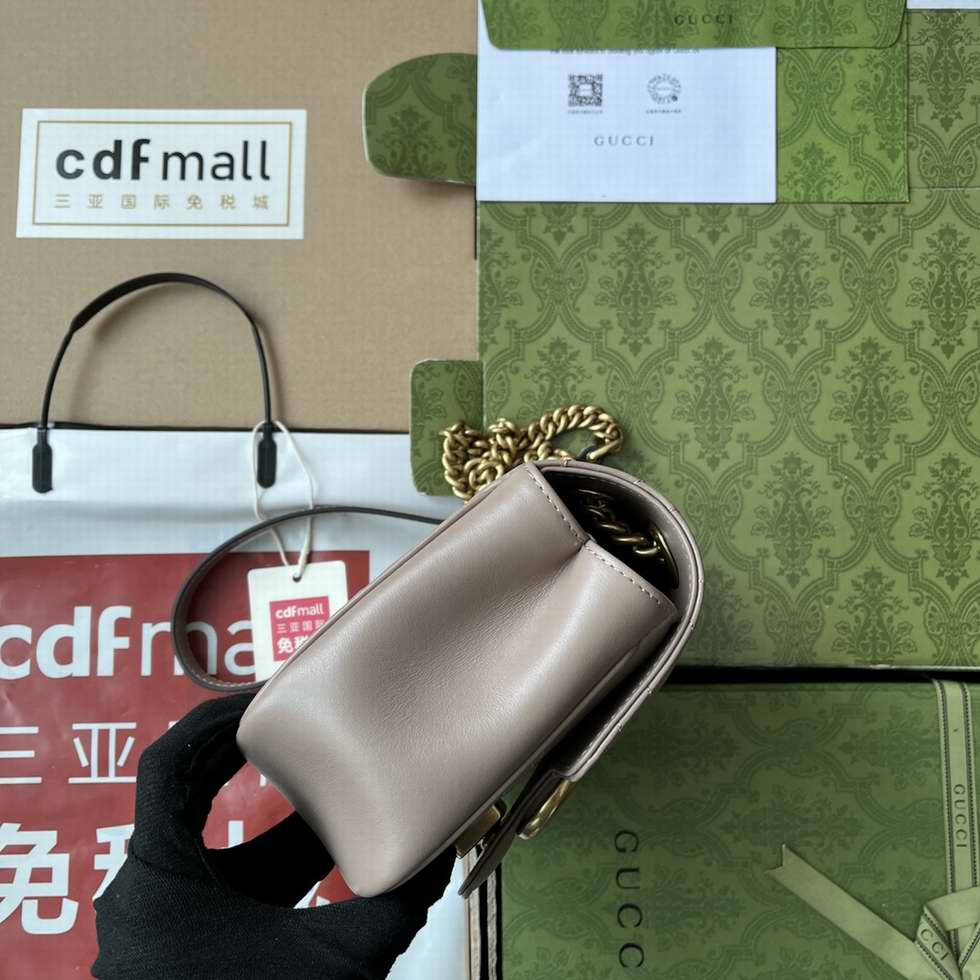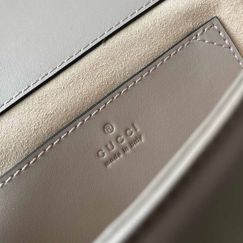 The GG Marmont has become synonymous with the House, thanks to its recognizable matelasse fabric and Double G hardware. Continuously reinvented through the seasons, new shapes are introduced within this signature line, matching Gucci's contemporary vision. Here, it's presented in white leather and further enriched with antique gold-toned details.