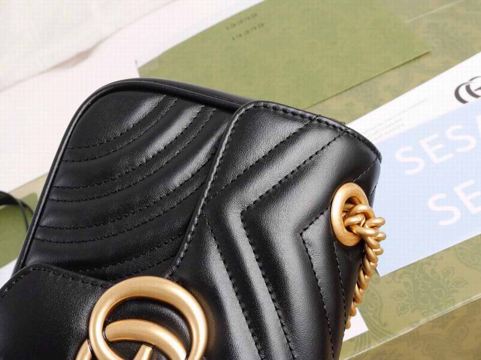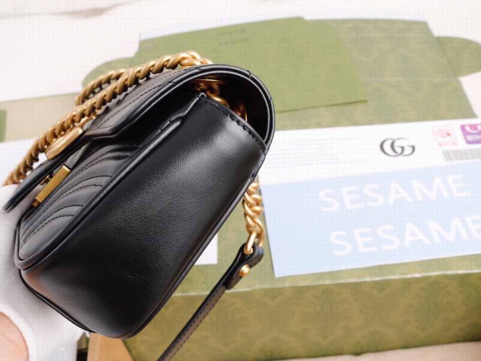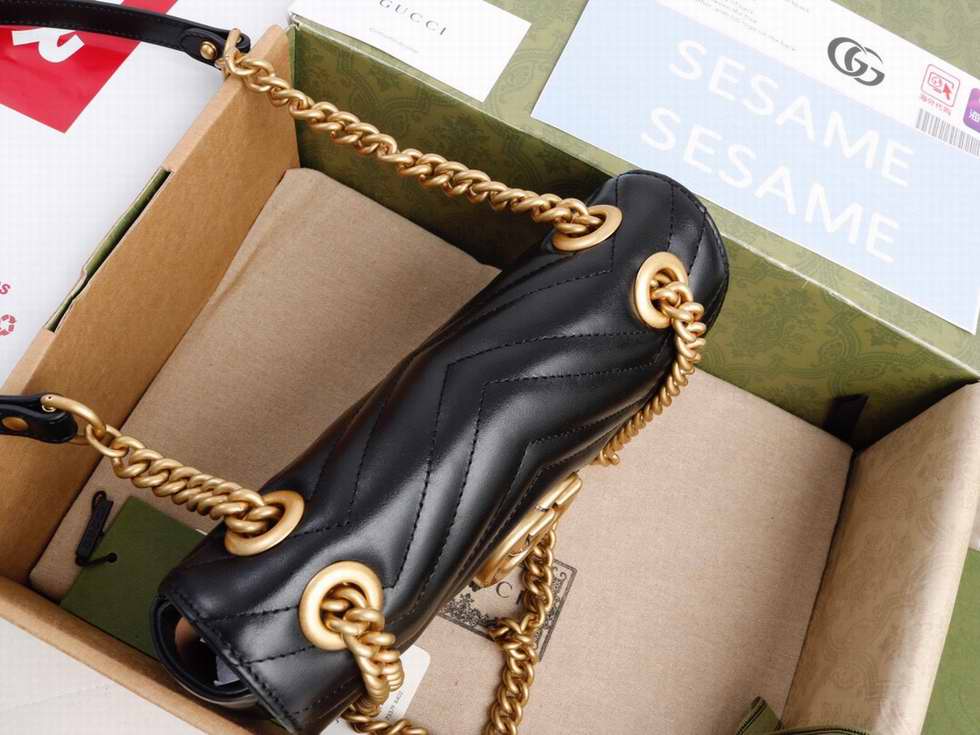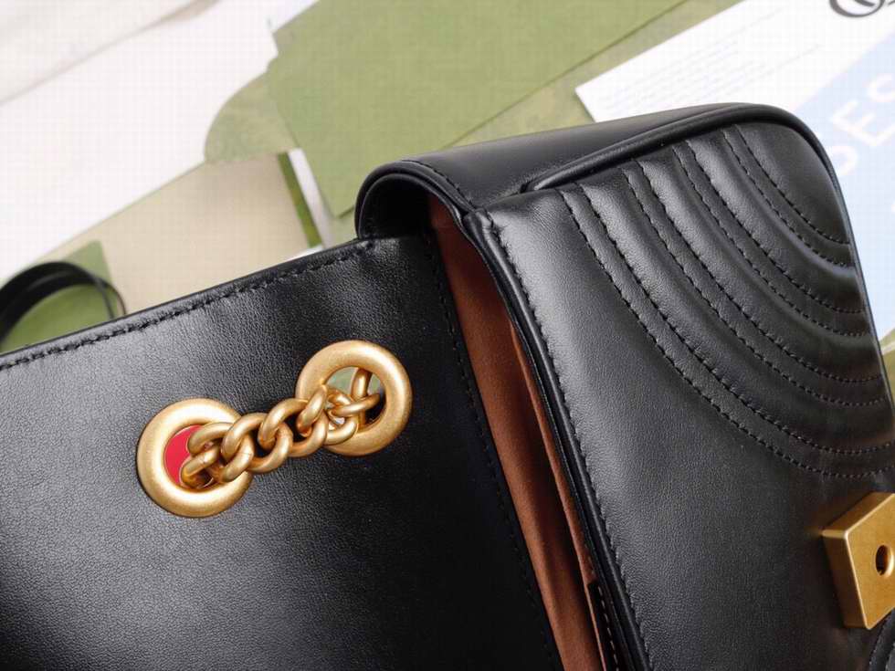 The small GG Marmont flap bag has a softly structured shape and an flap closure with Double G hardware. The sliding chain strap can be worn multiple ways, changing between a shoulder and a top handle bag. Made in matelasse chevron leather with a heart on the back.